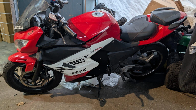 Pre-owned Rawatron electric motorcycle. Red and black cruiser style. Features include saddlebags and passenger seat. Good condition..brand new available too