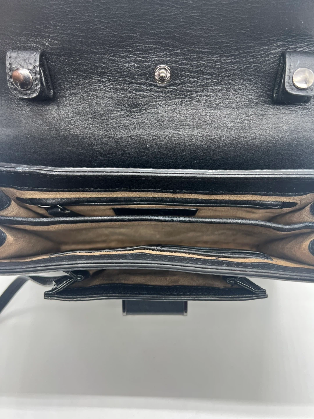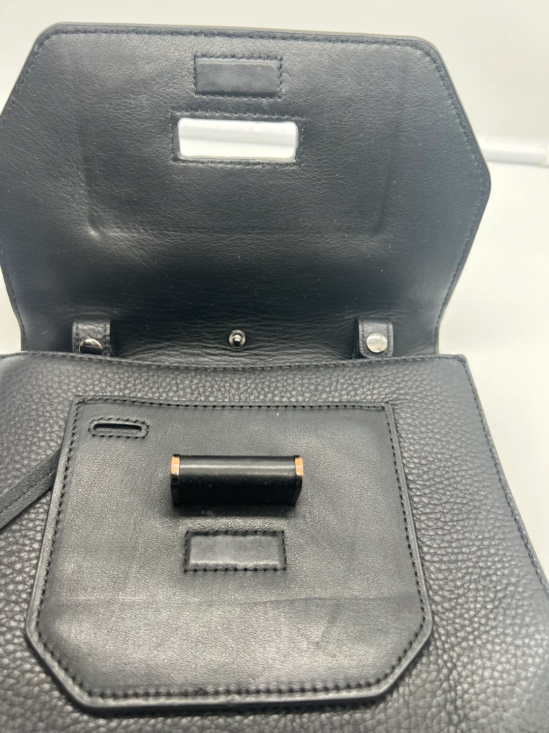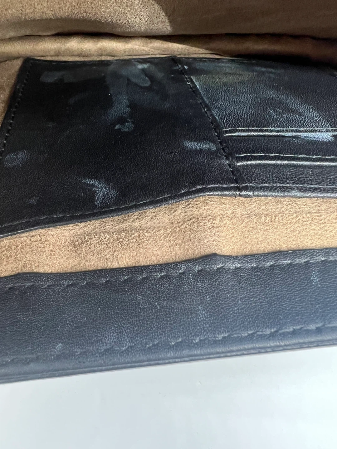 Faint scuffing/tarnishing on the hardware. Faint wear on the body. White marks on the inside pockets/brand tab.