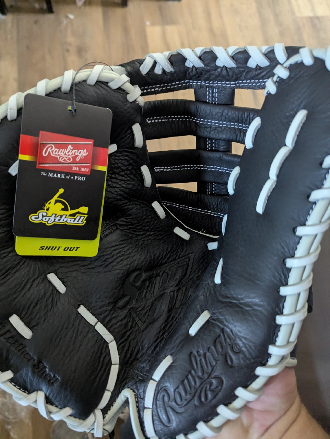 Selling a brand new Rawlings Shut Out softball glove! It's a sleek black colour with white laces, LH throw