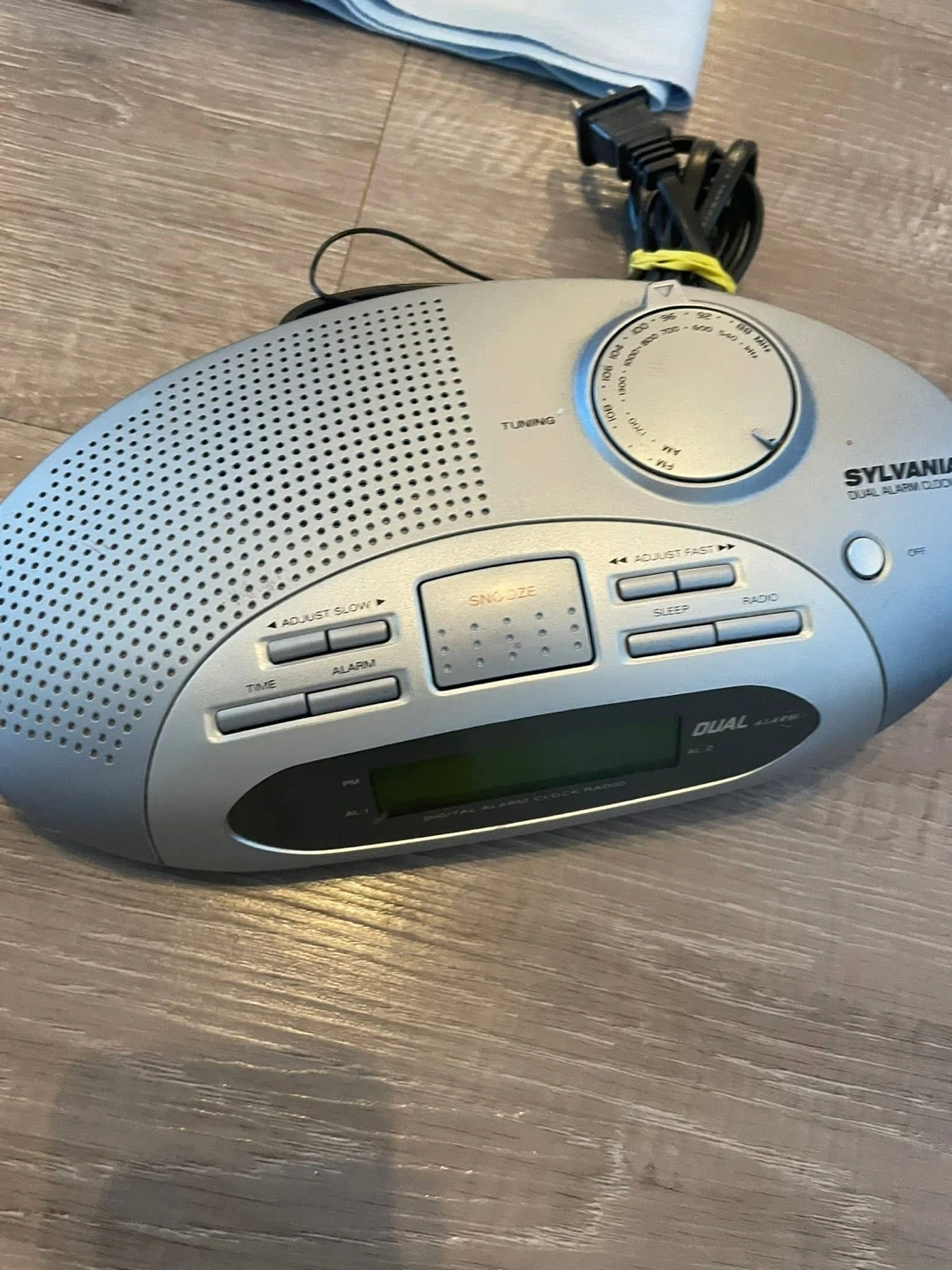 This Sylvania dual alarm clock radio is silver. It features a digital display and AM/FM tuning. It has controls for time, alarm, snooze, sleep, and radio.