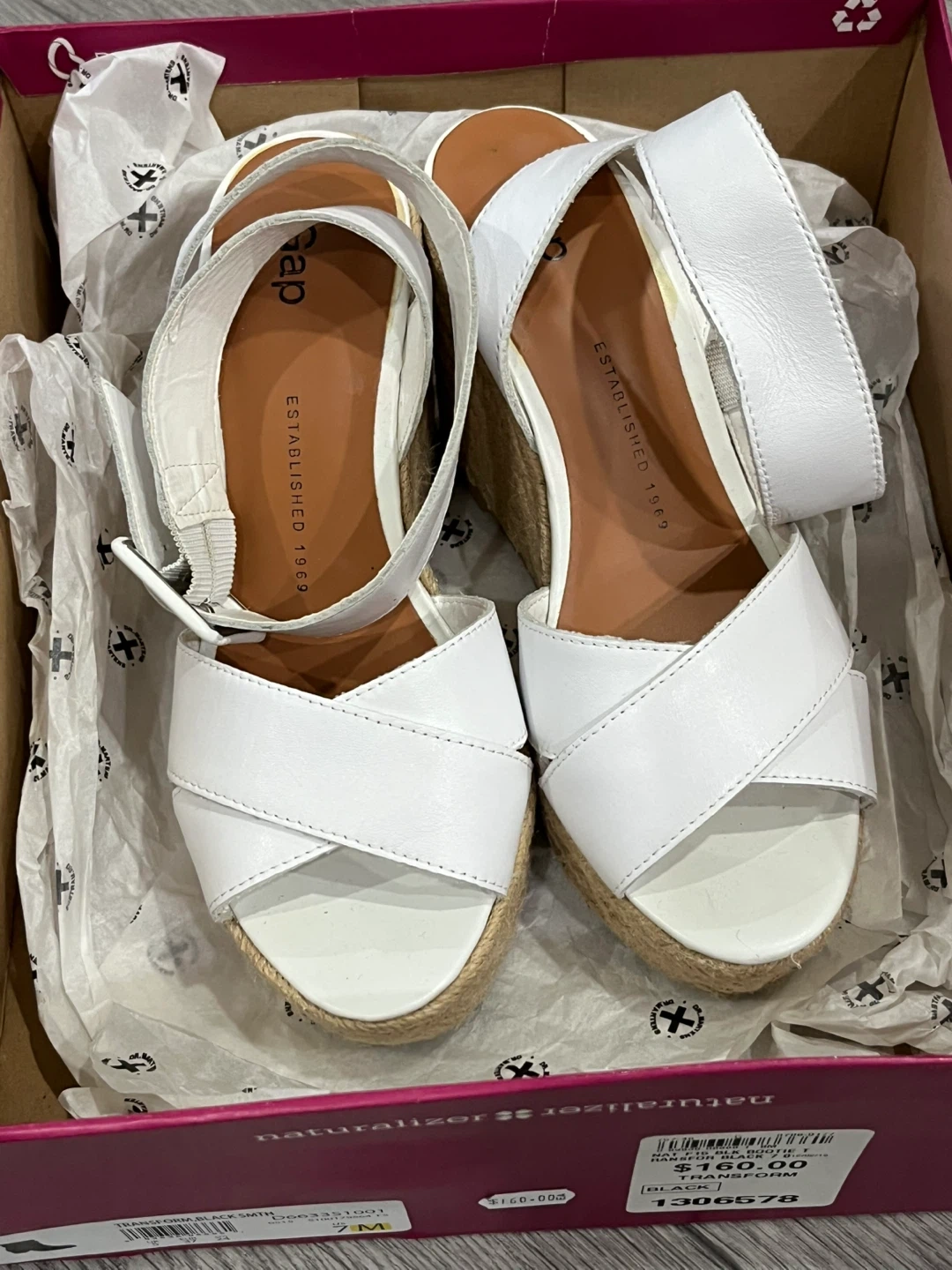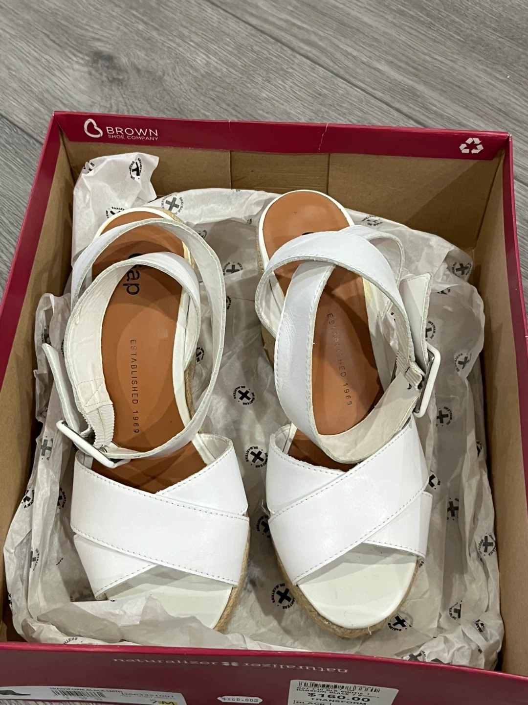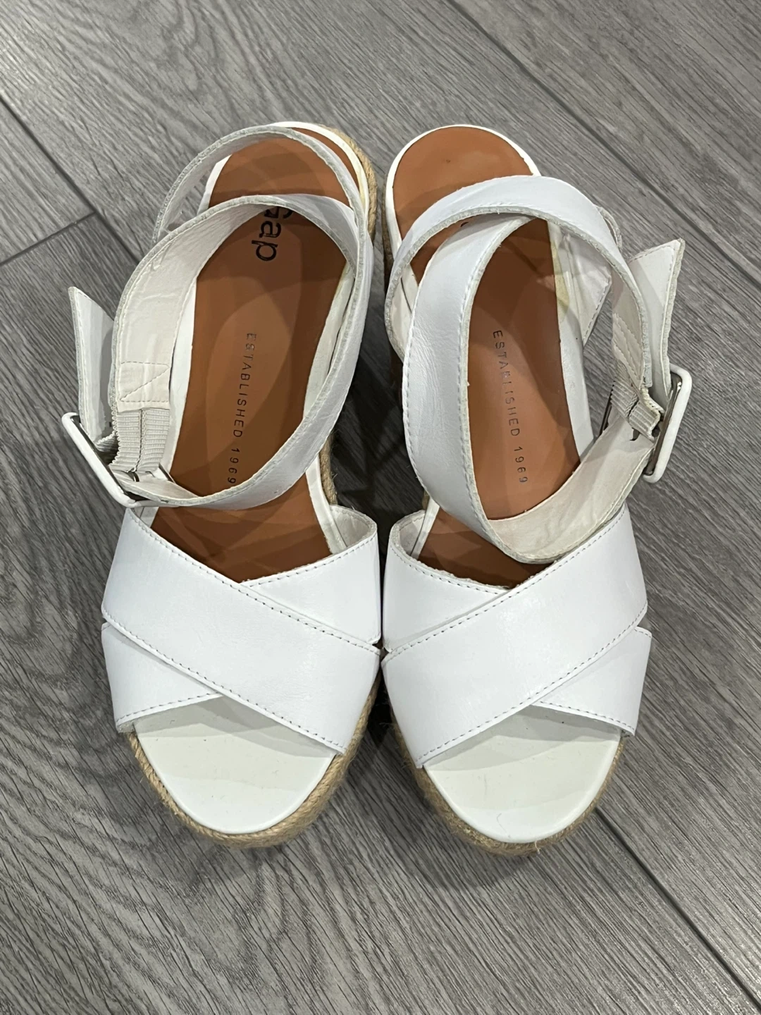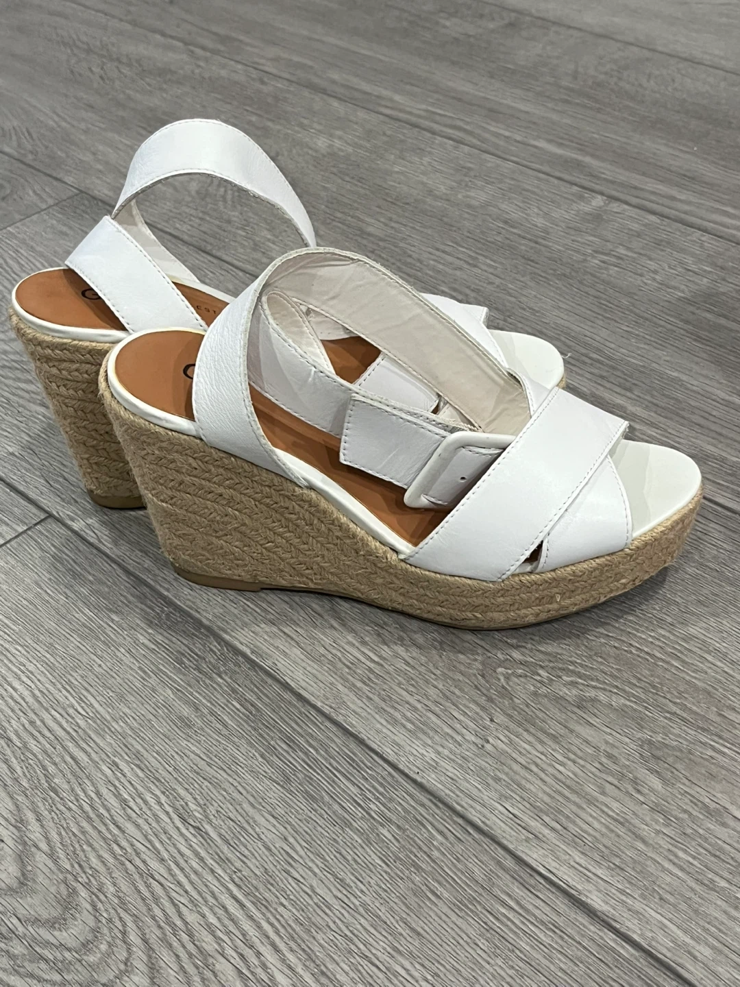 White leather espadrille wedge sandals with adjustable ankle straps. These stylish wedges feature a criss-cross toe design and a natural jute-wrapped sole. They're perfect for adding a touch of height and elegance to any outfit this summer!