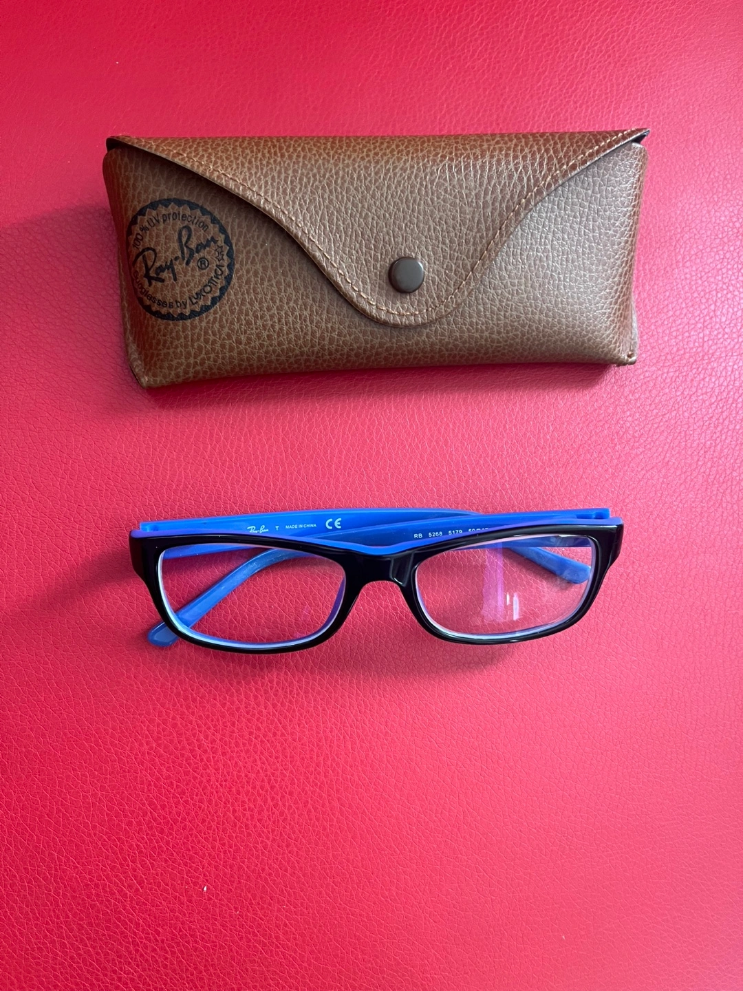 Ray-Ban eyeglasses. Blue plastic frame. Includes case. Good condition.
