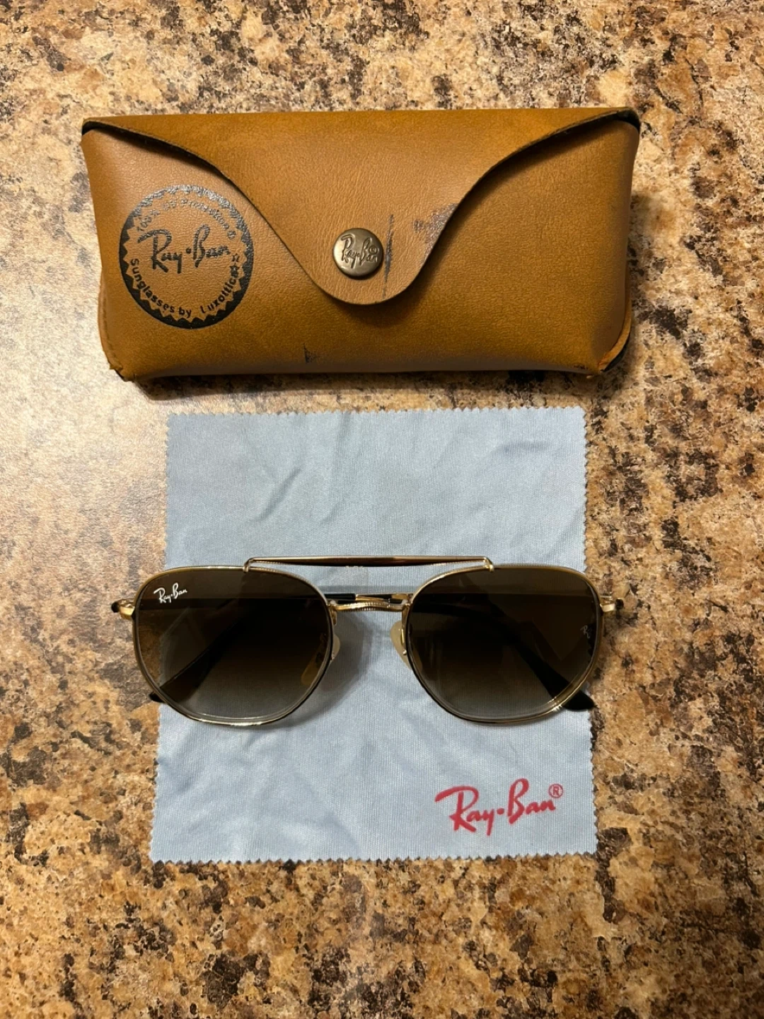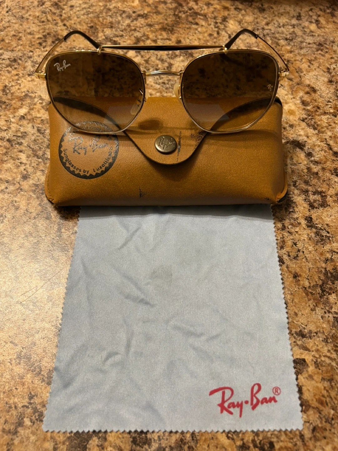 Selling a pair of Ray-Ban sunglasses! They come with the original case and cleaning cloth. The frames are gold and the lenses are a gradient brown. A stylish addition to your summer wardrobe! Call/txt 6478242181