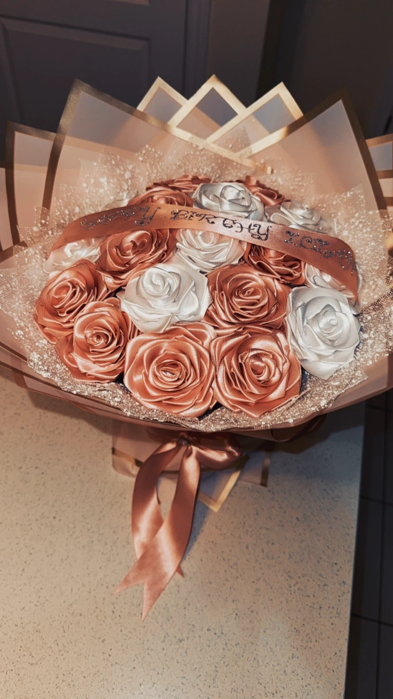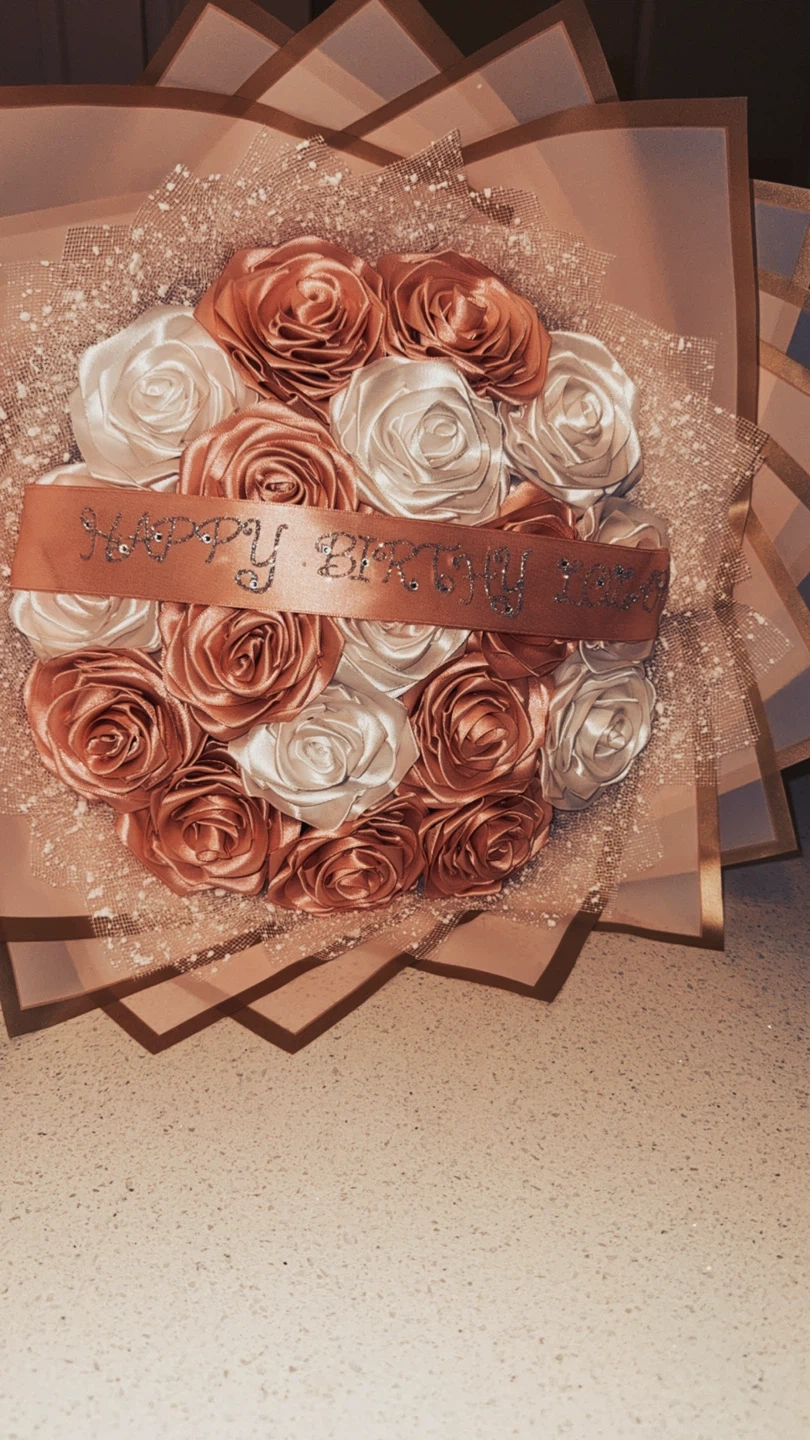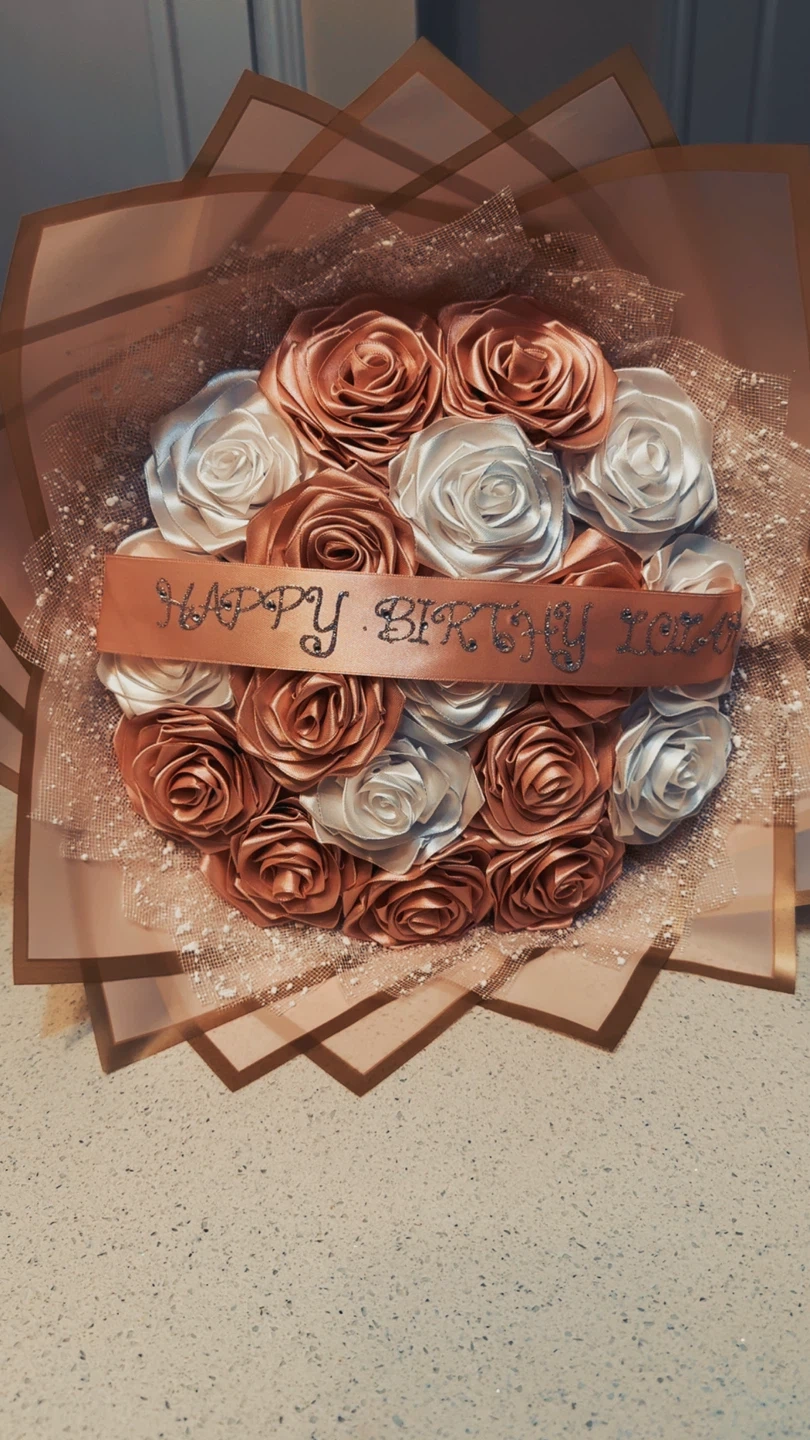 A beautiful bouquet with satin roses in rose gold and white. It features a "Happy Birthday" ribbon. This bouquet is perfect for celebrations and gifting!