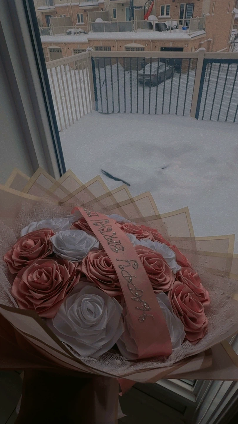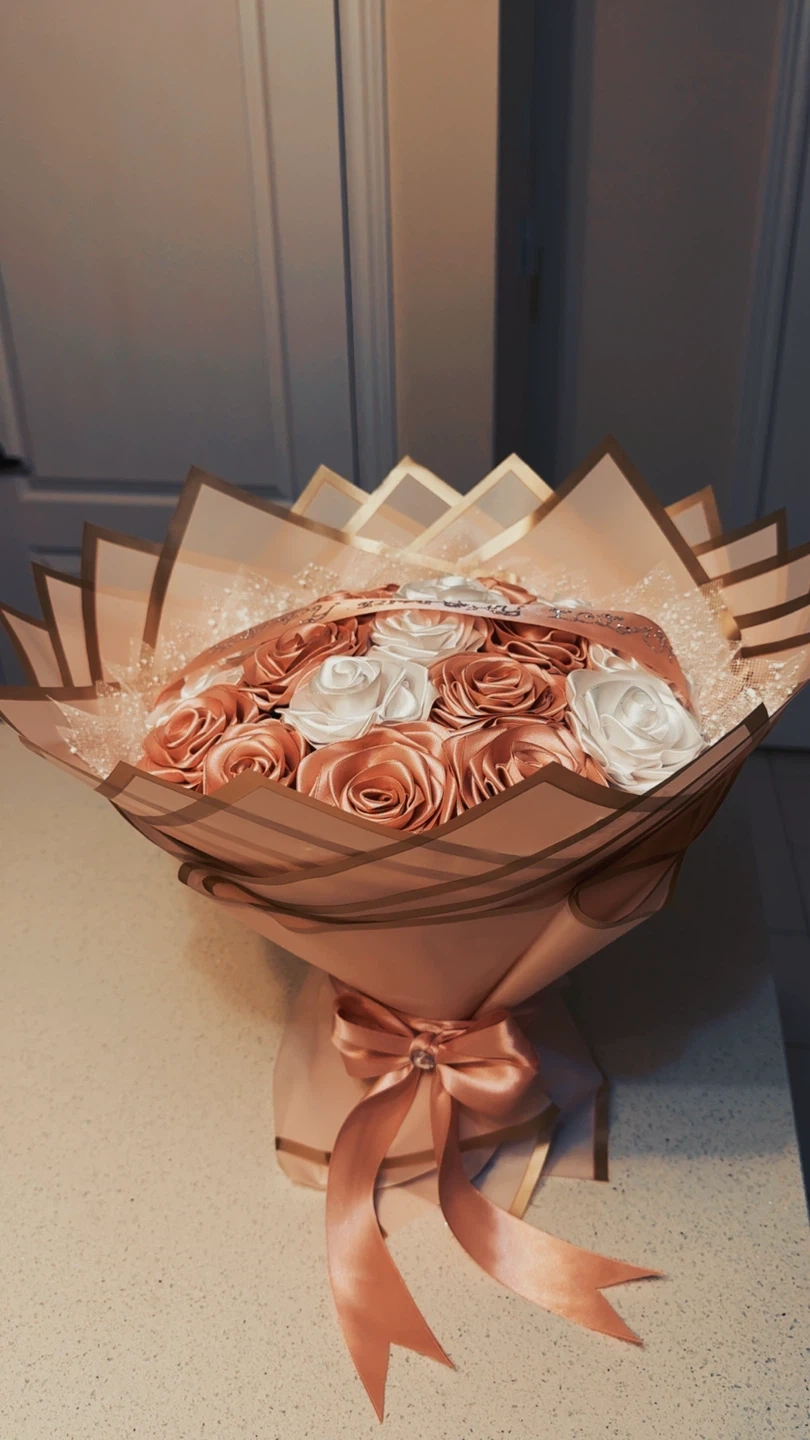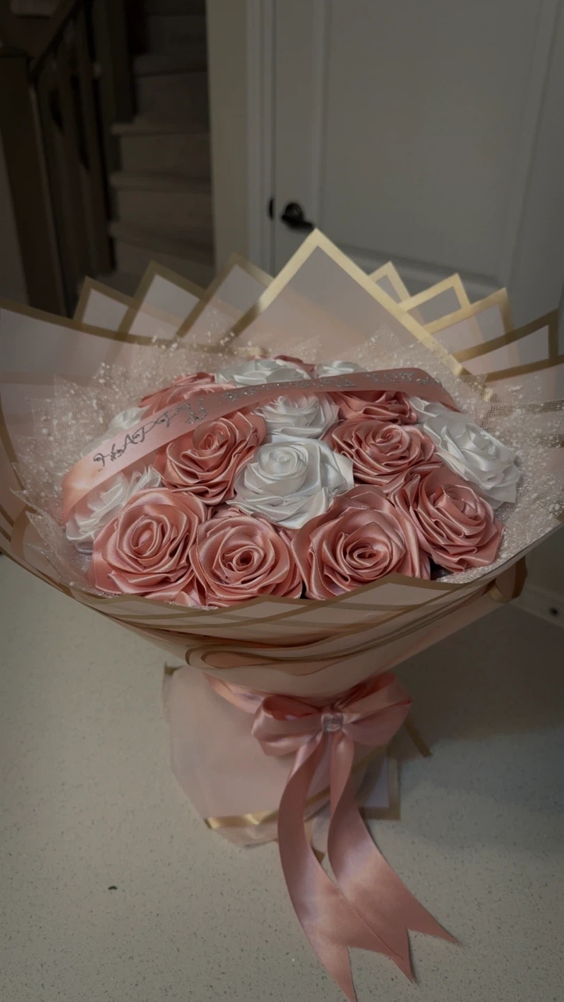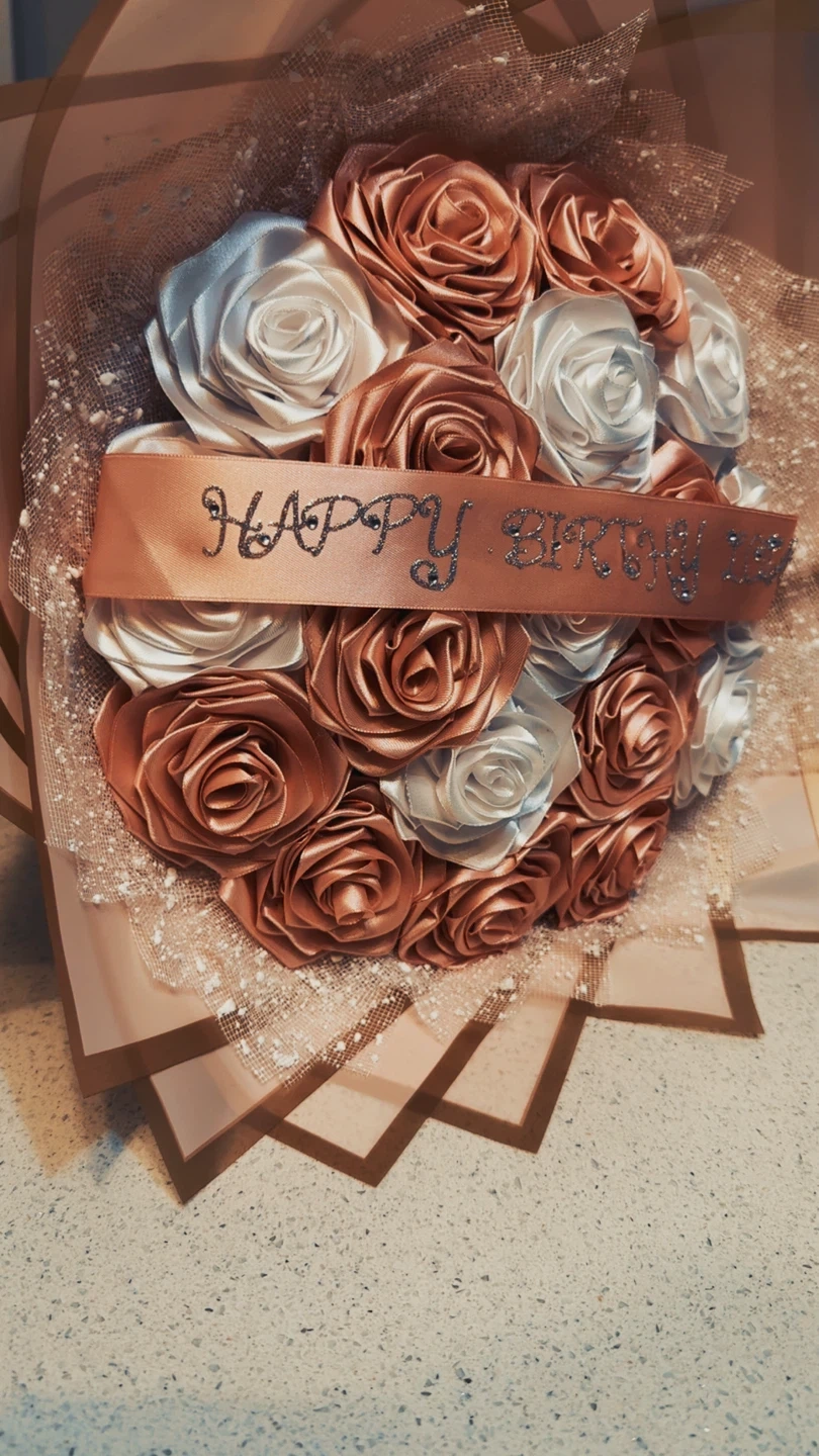 A beautiful bouquet with satin roses in rose gold and white. It features a "Happy Birthday" ribbon. This bouquet is perfect for celebrations and gifting!