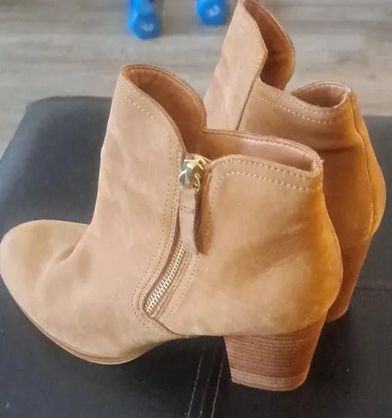 Stylish tan ankle boots crafted from suede material. They feature a convenient side zipper for easy on and off. Heel height is approximately 2 inches.