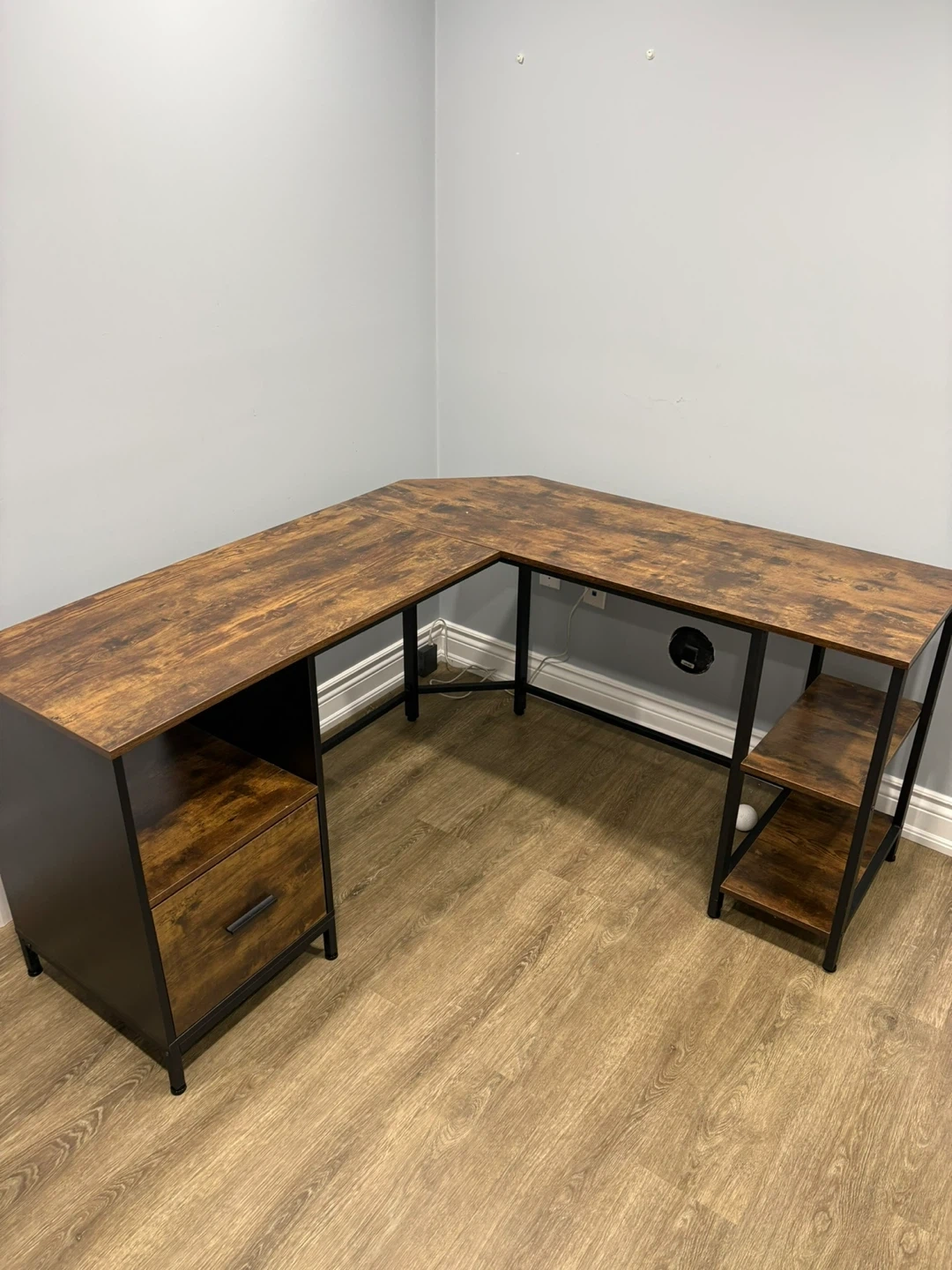 This L-shaped desk offers a spacious work surface with a built-in drawer and two open shelves for storage. Its rustic wood grain finish and black metal frame blend well in most home office setups. The desk provides ample room for computers, documents, and decor.