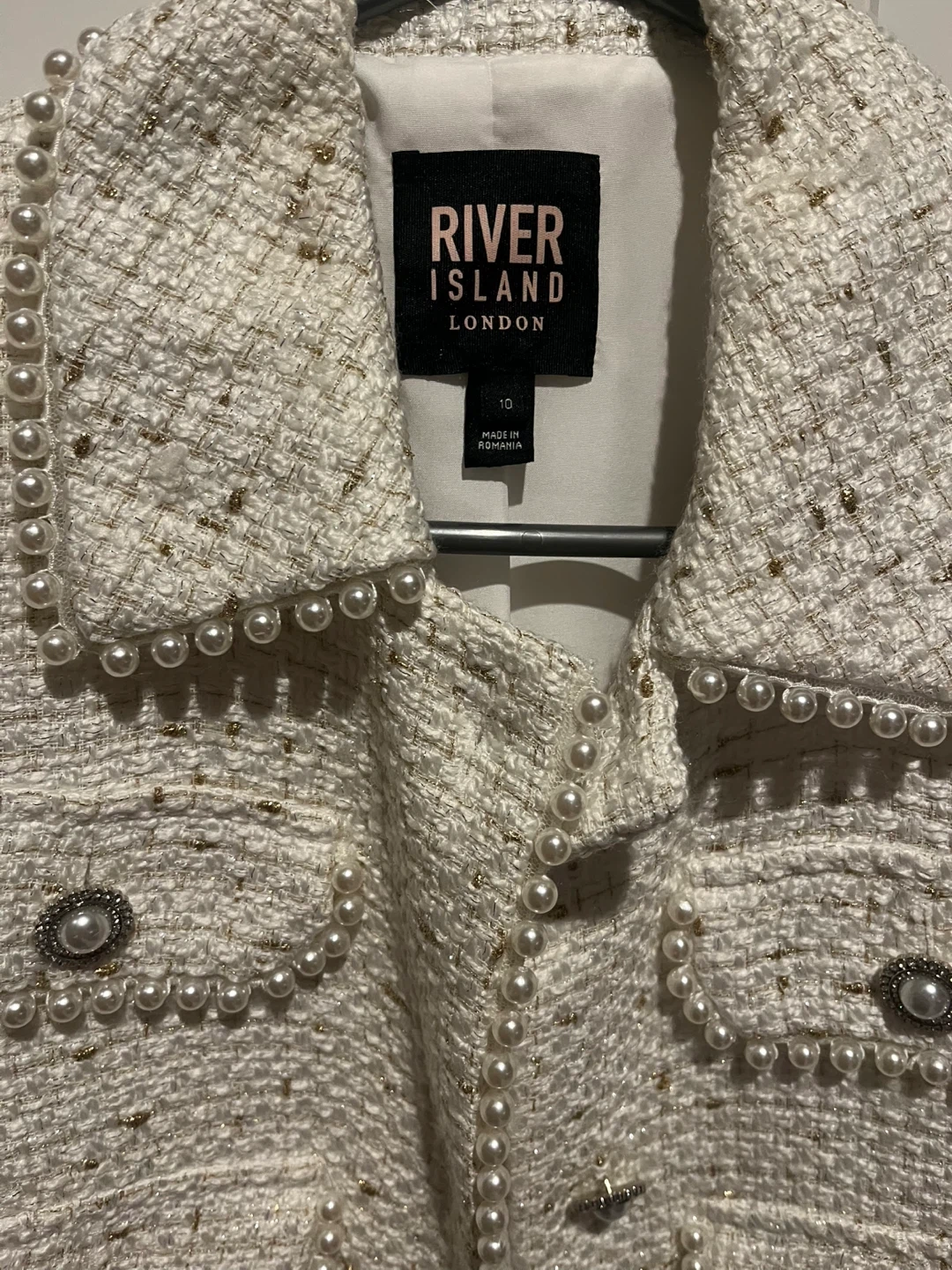 This River Island jacket is white and features pearl embellishments. It's a size 10. The material is a textured tweed with gold flecks. Frayed hem detail.size 10