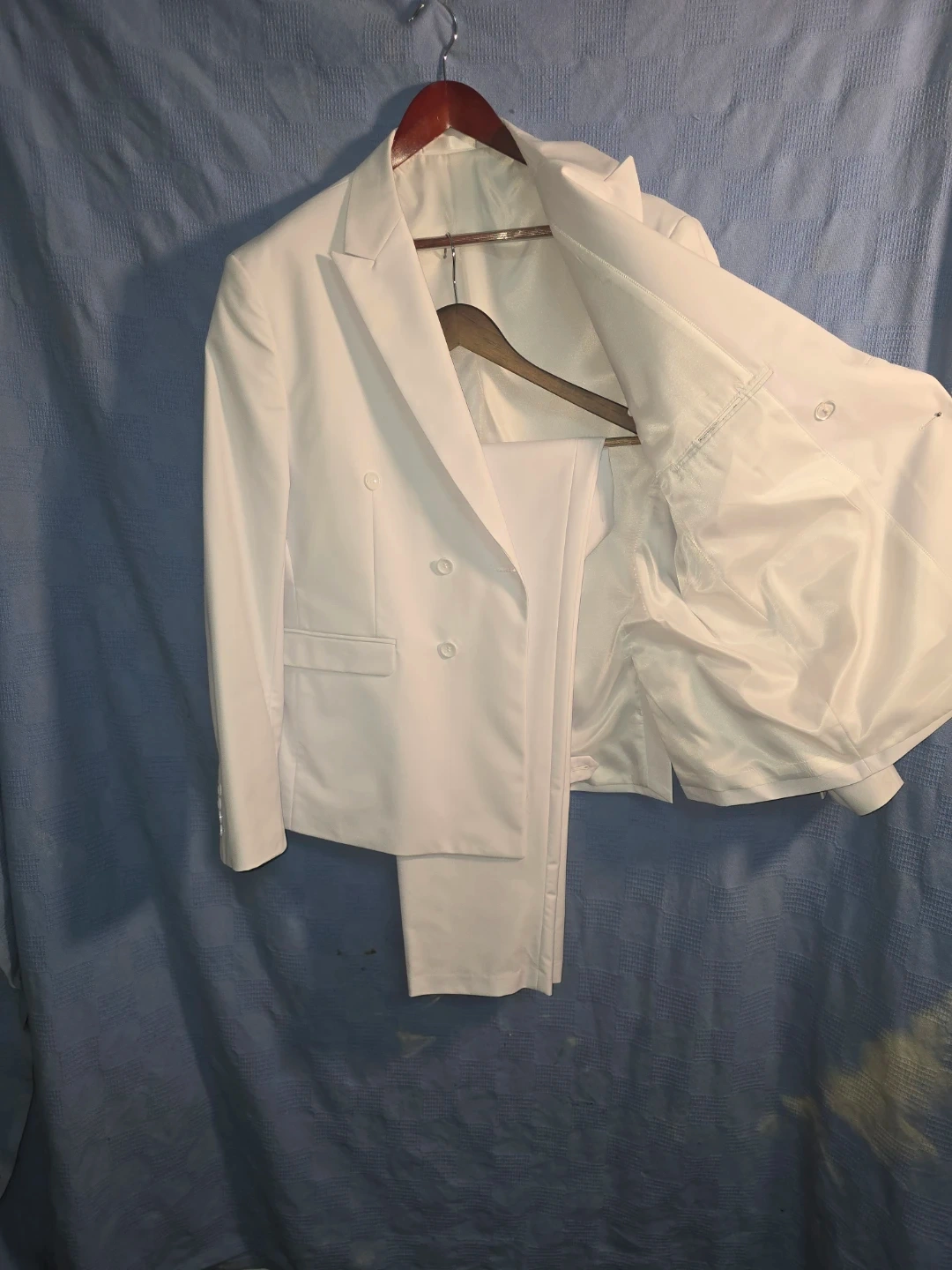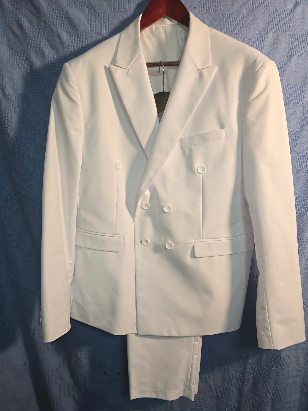 Selling a white double-breasted suit. It appears to be in good condition and is a striking choice for a special event or a unique look. Feel free to ask any questions!