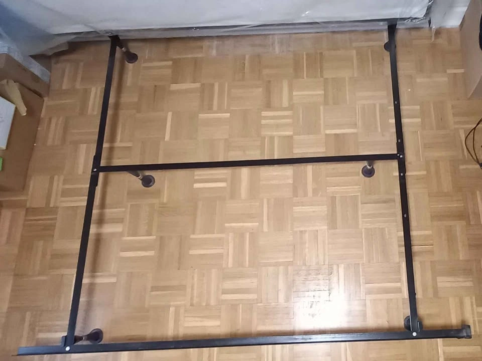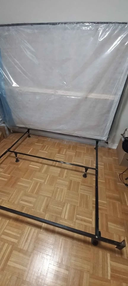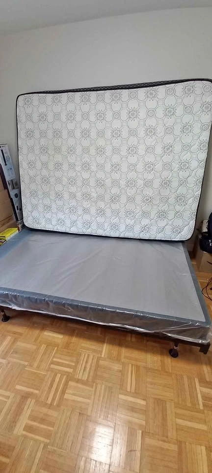Complete queen size bed set including a metal frame, a supportive wooden box spring, and a comfortable six-inch foam mattress. This set has been used but is in good condition and ready for a new home. Mattress cover (fitted sheet) and 3 pillows with covers are posted separately. If the ad is up, the bed is available! Pick up only. From a smoke free, pet free, bug free home. Location - 10 ionview road Scarborough.