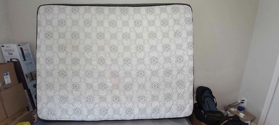 Complete queen size bed set including a metal frame, a supportive wooden box spring, and a comfortable six-inch foam mattress. This set has been used but is in good condition and ready for a new home. Mattress cover (fitted sheet) and 3 pillows with covers are posted separately. If the ad is up, the bed is available! Pick up only. From a smoke free, pet free, bug free home. Location - 10 ionview road Scarborough.