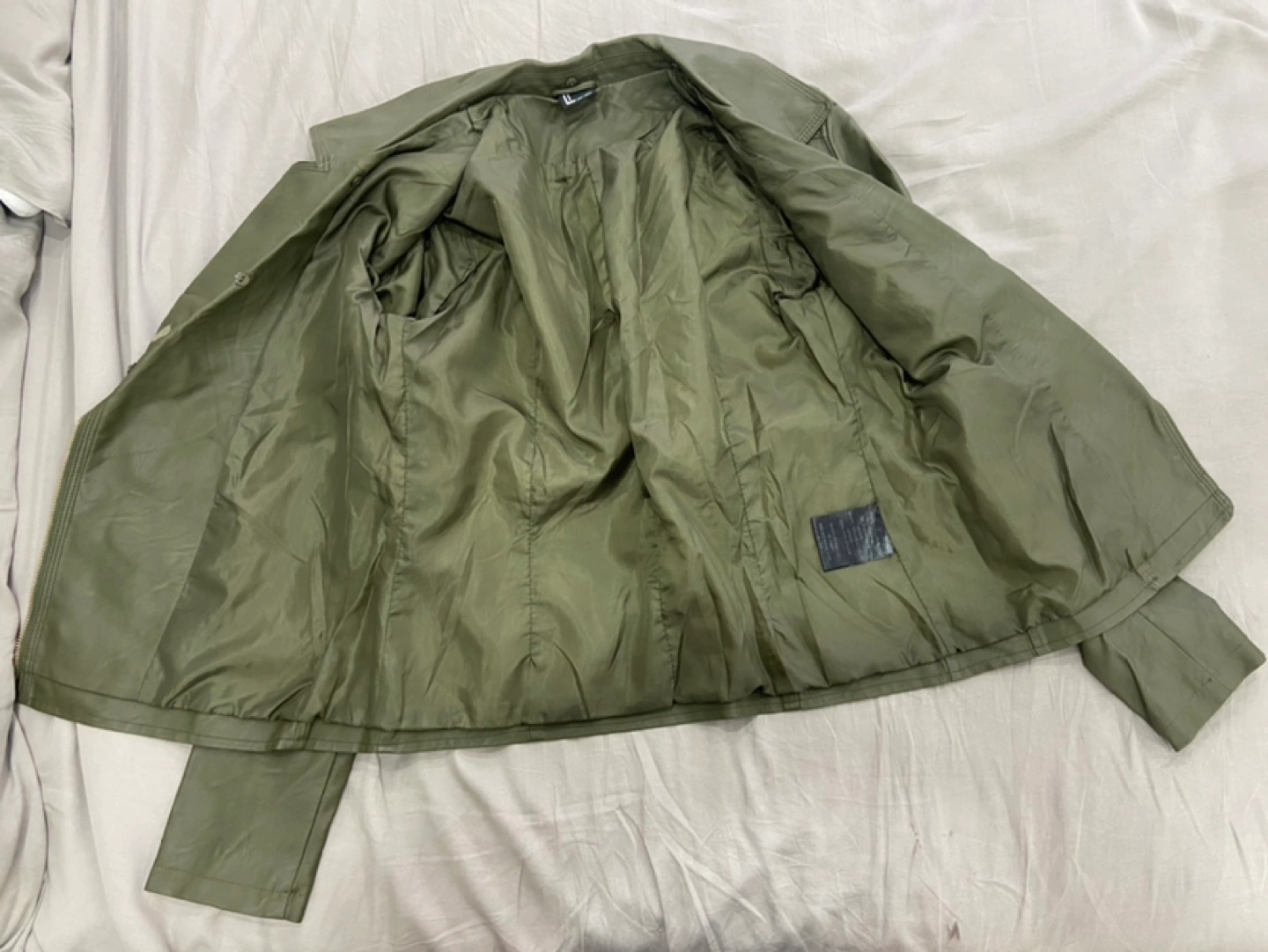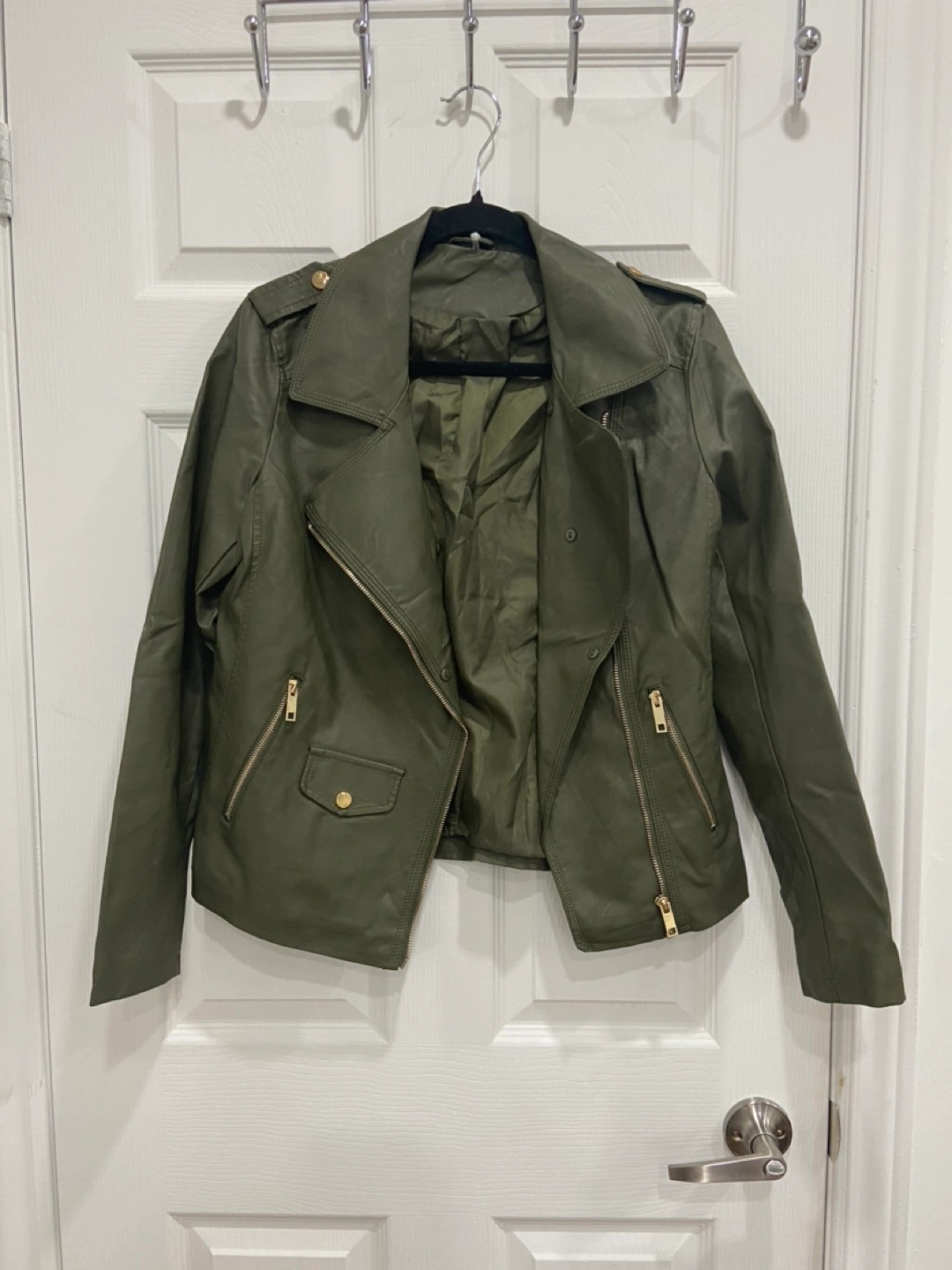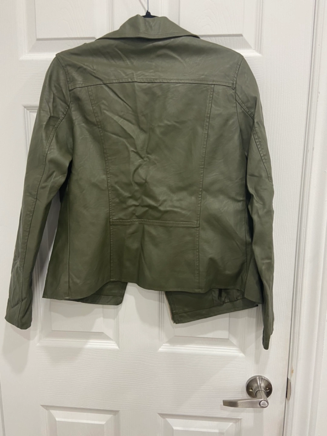Olive colour faux leather jacket with gold hardware. Zipper closure and two zippered pockets. Never been worn. Size Medium.