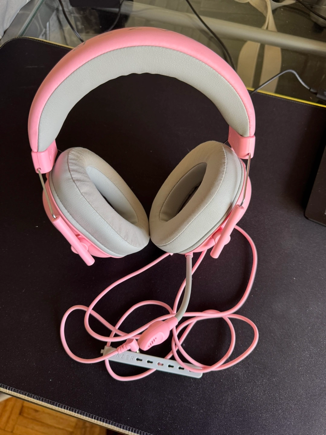 Selling a Razer BlackShark V2 X gaming headset in quartz pink! It features 50mm drivers and a cardioid mic. It's lightweight and comfortable, with noise-isolating earcups. Perfect for PC, PS4, PS5, and Switch, and uses a 3.5mm audio jack