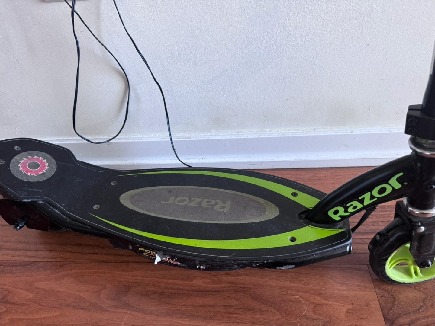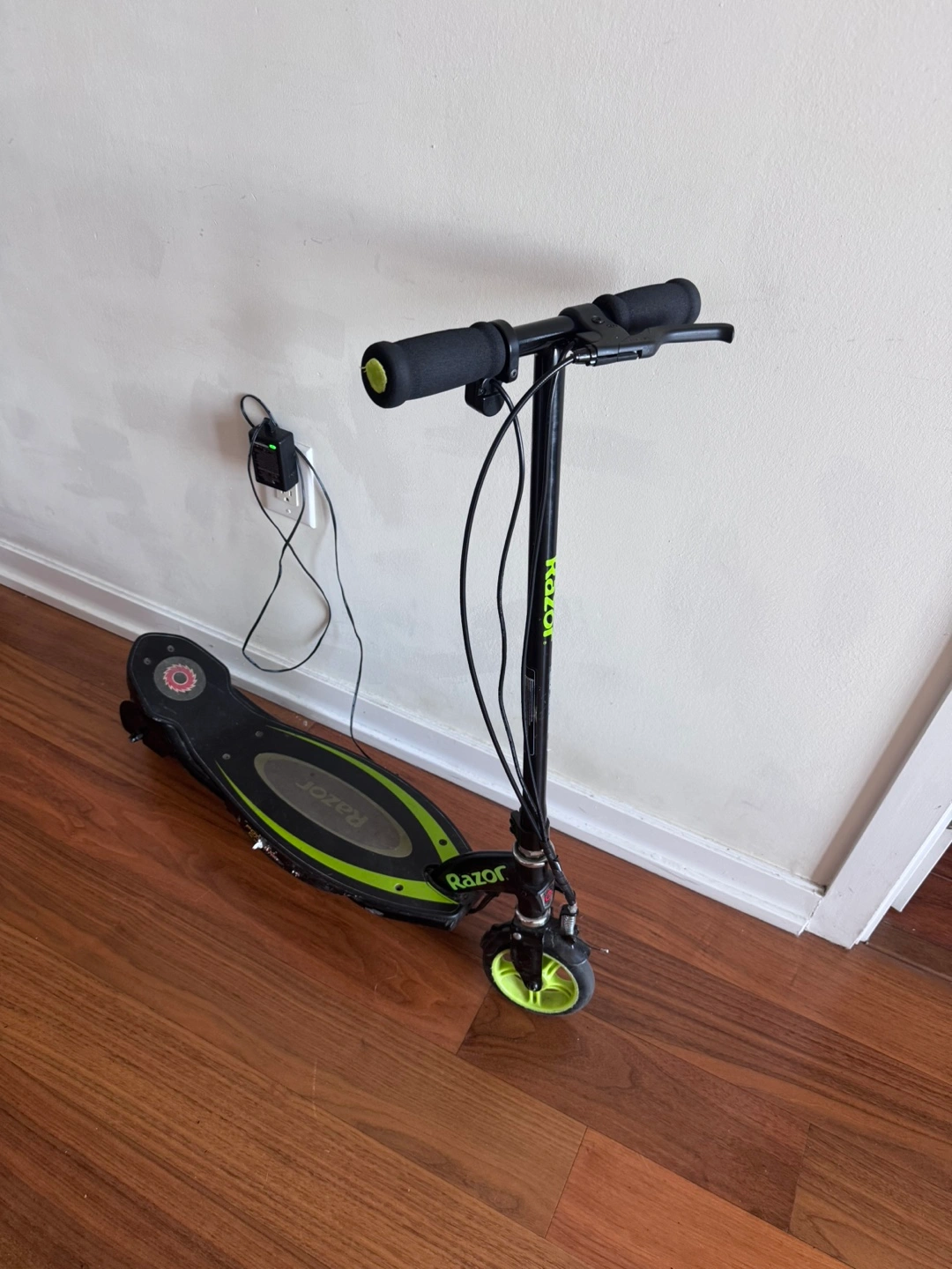 Selling a Razor electric scooter in black and green! It comes with a charger. It shows some signs of use, but it's still in good working condition and ready for some fun rides!