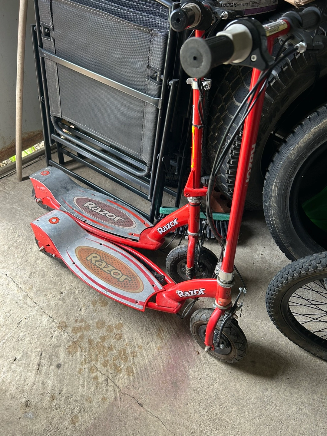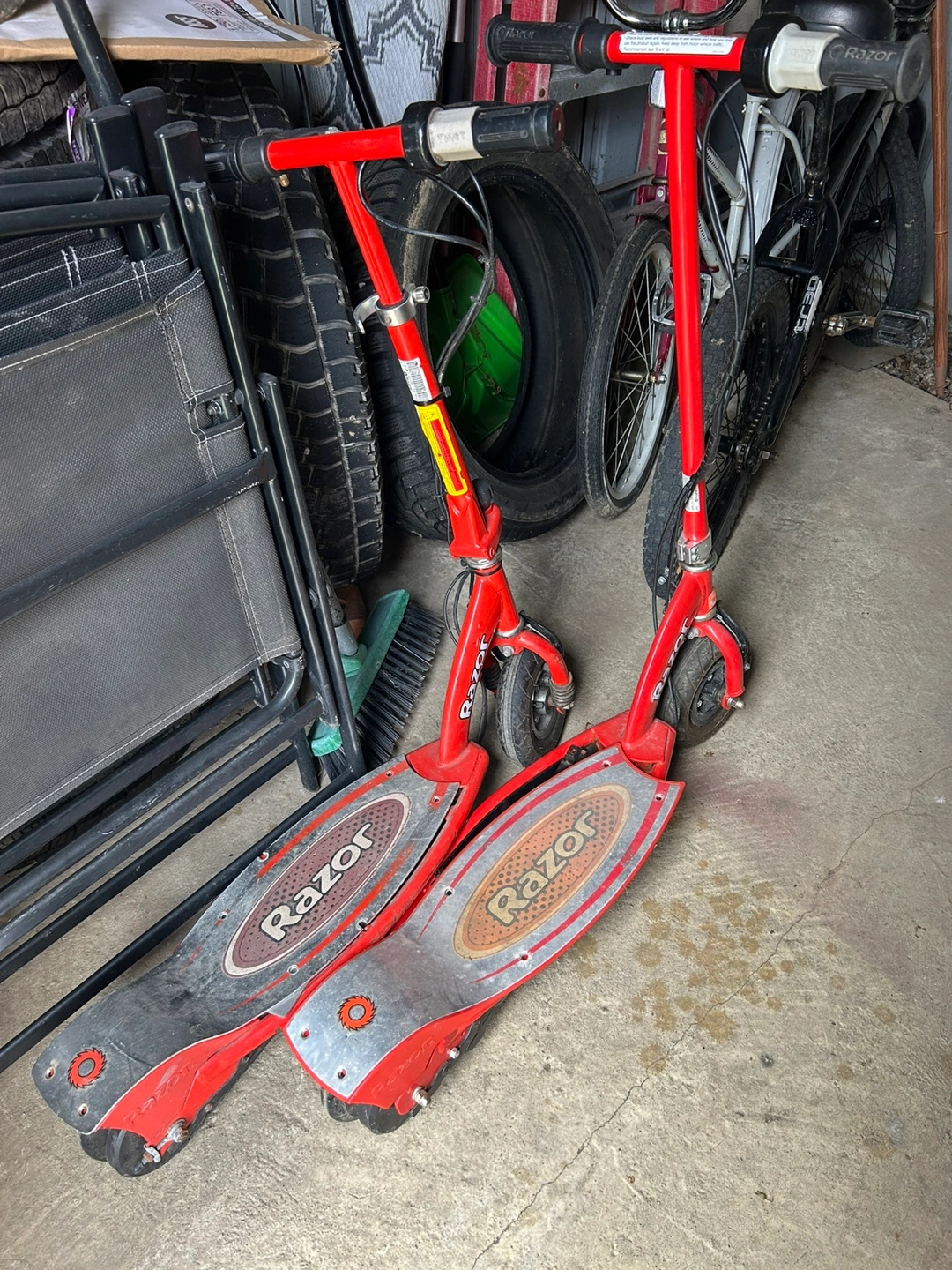 -Two red Razor scooters. Features handlebars and foot platforms. Perfect for enjoying a leisurely ride around the neighborhood, a great way to relieve stress. -Need batteries and possibly a controller. -Motor works perfectly fine..