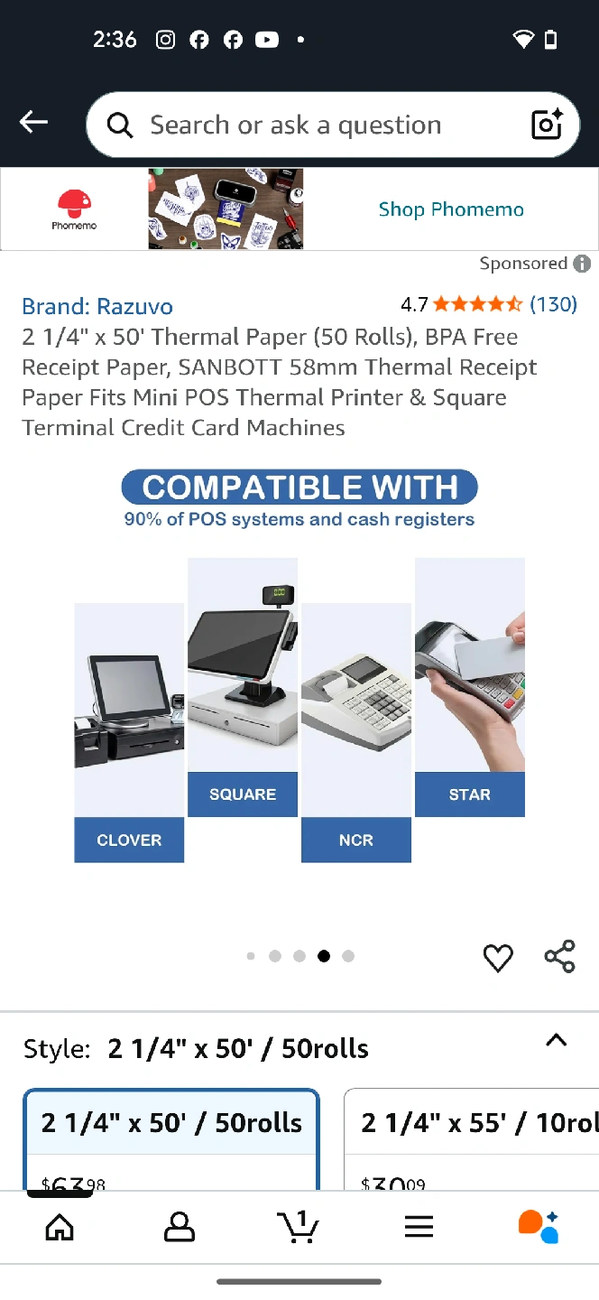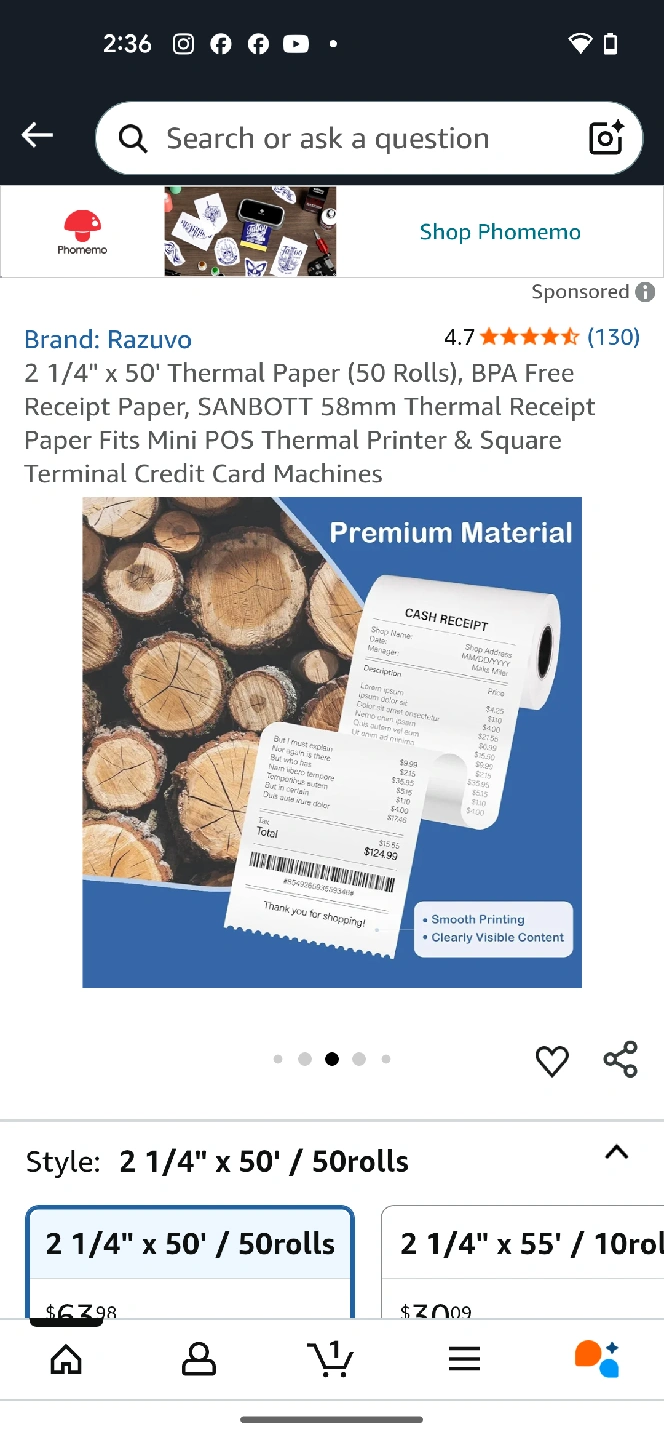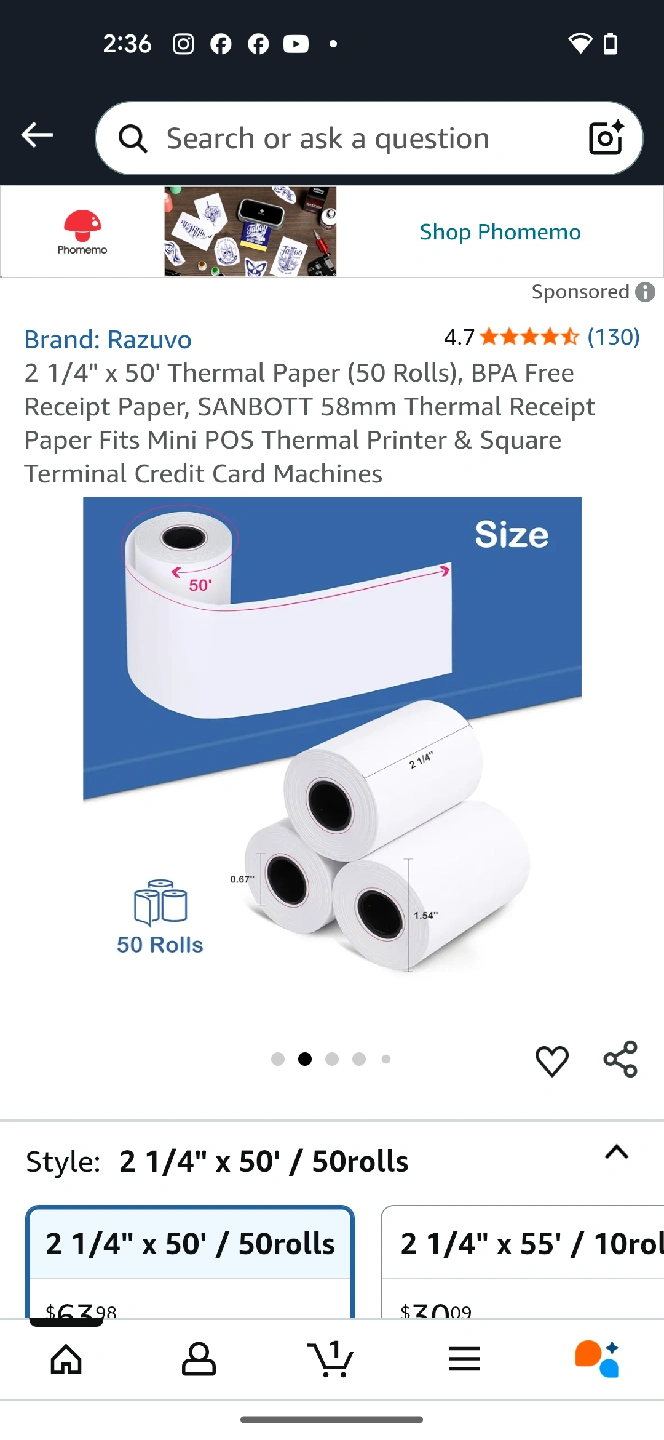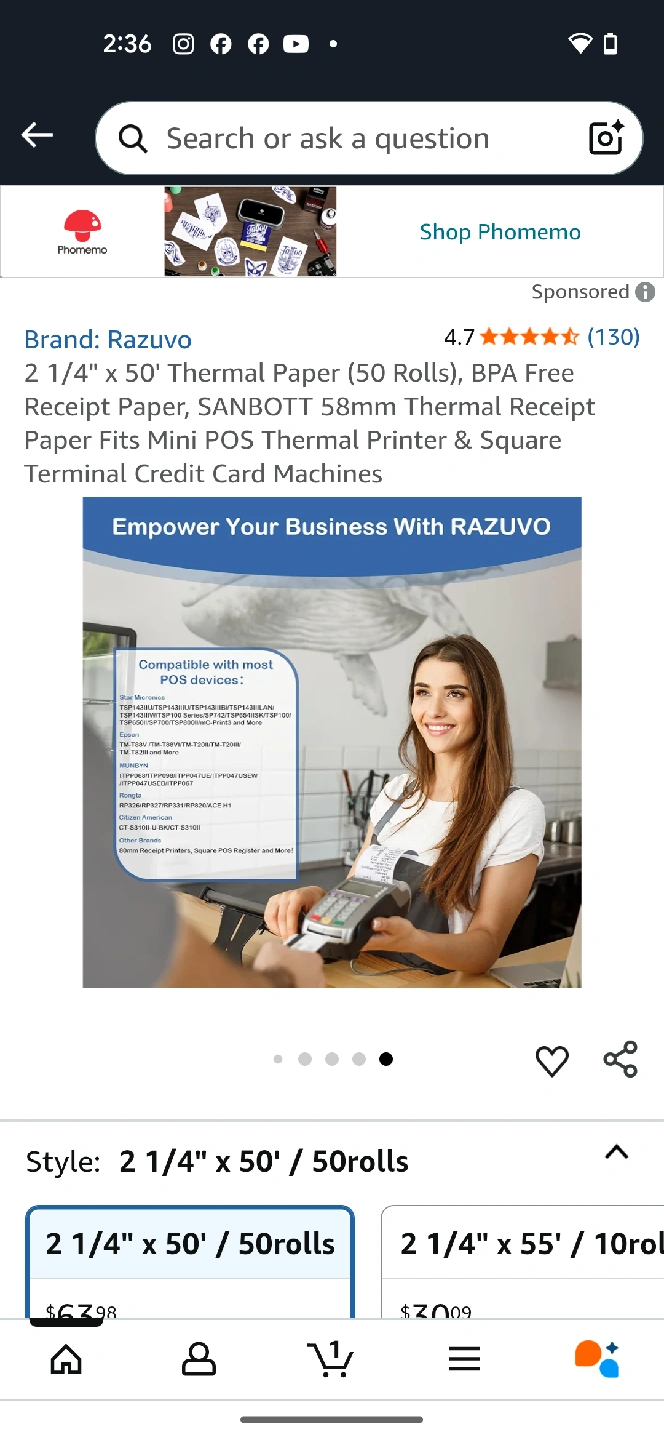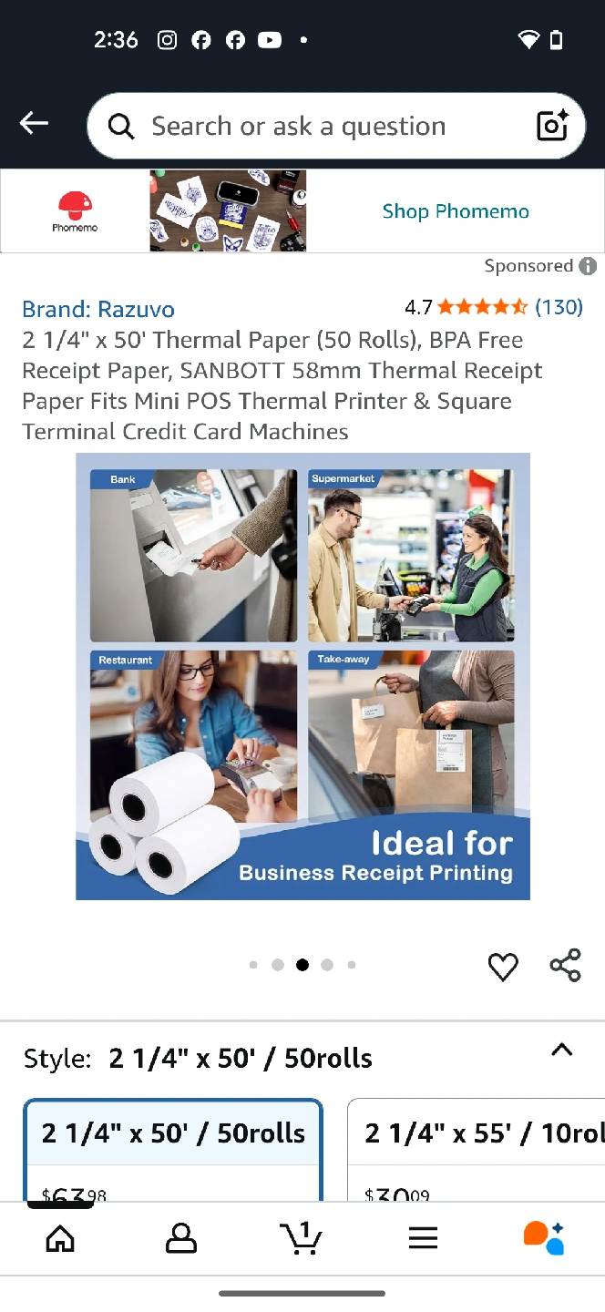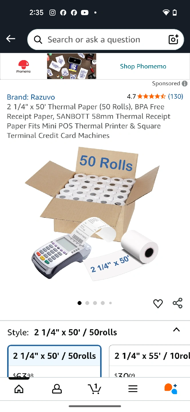 Selling a box of Razuvo thermal paper rolls. These are 2 1/4" x 50' in size and come with 50 rolls in the box. They're BPA-free and fit SANBOTT 58mm thermal printers and Square terminal credit card machines. Ideal for business receipt printing!
