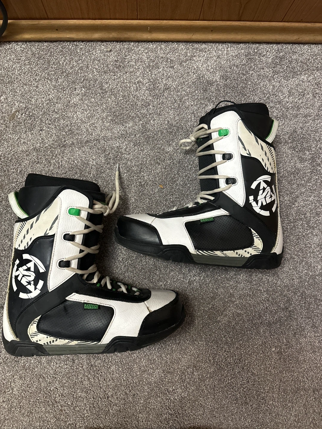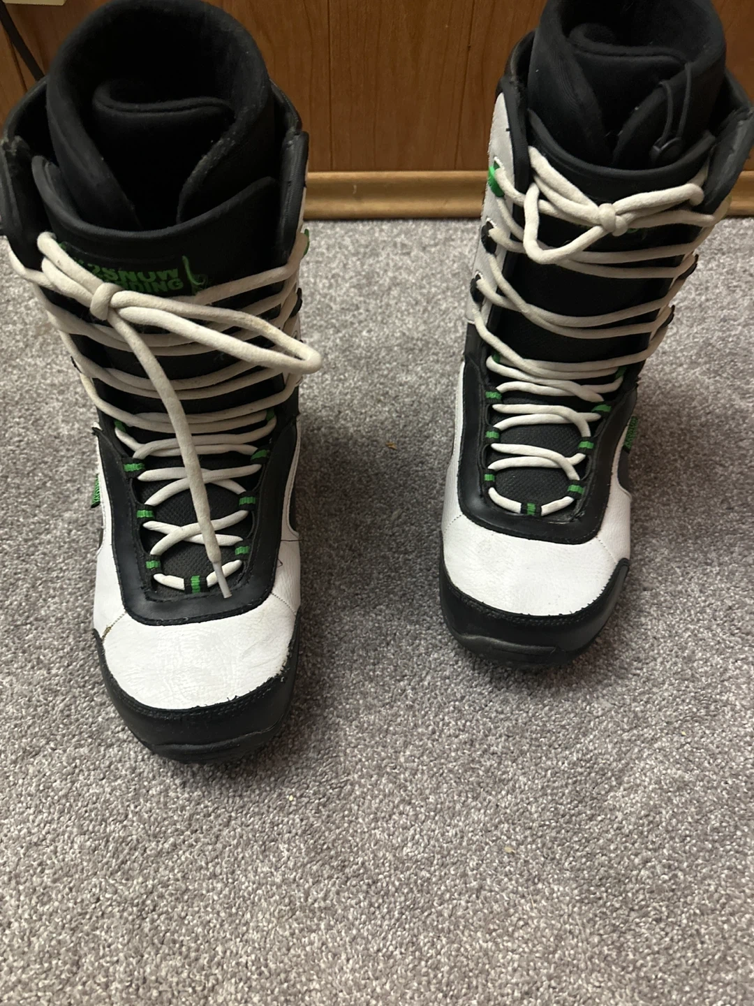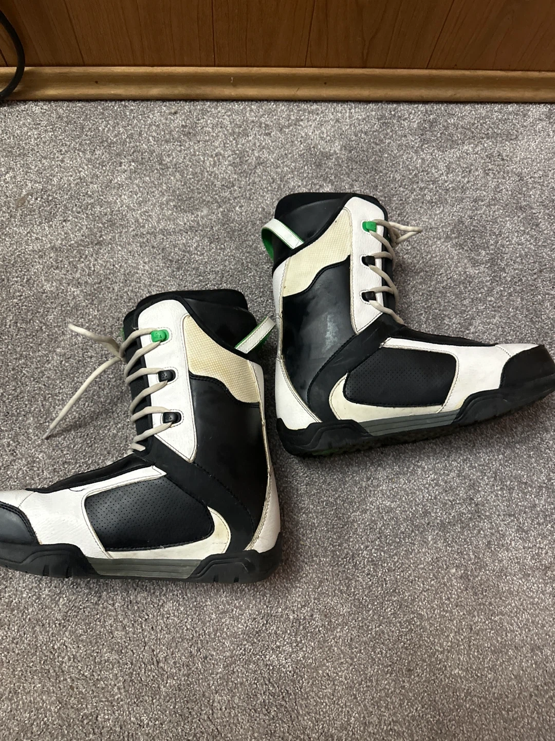 303Selling a pair of RAZZ snowboarding boots in men's size 11. They are black and white with green accents. Great for hitting the slopes this winter!