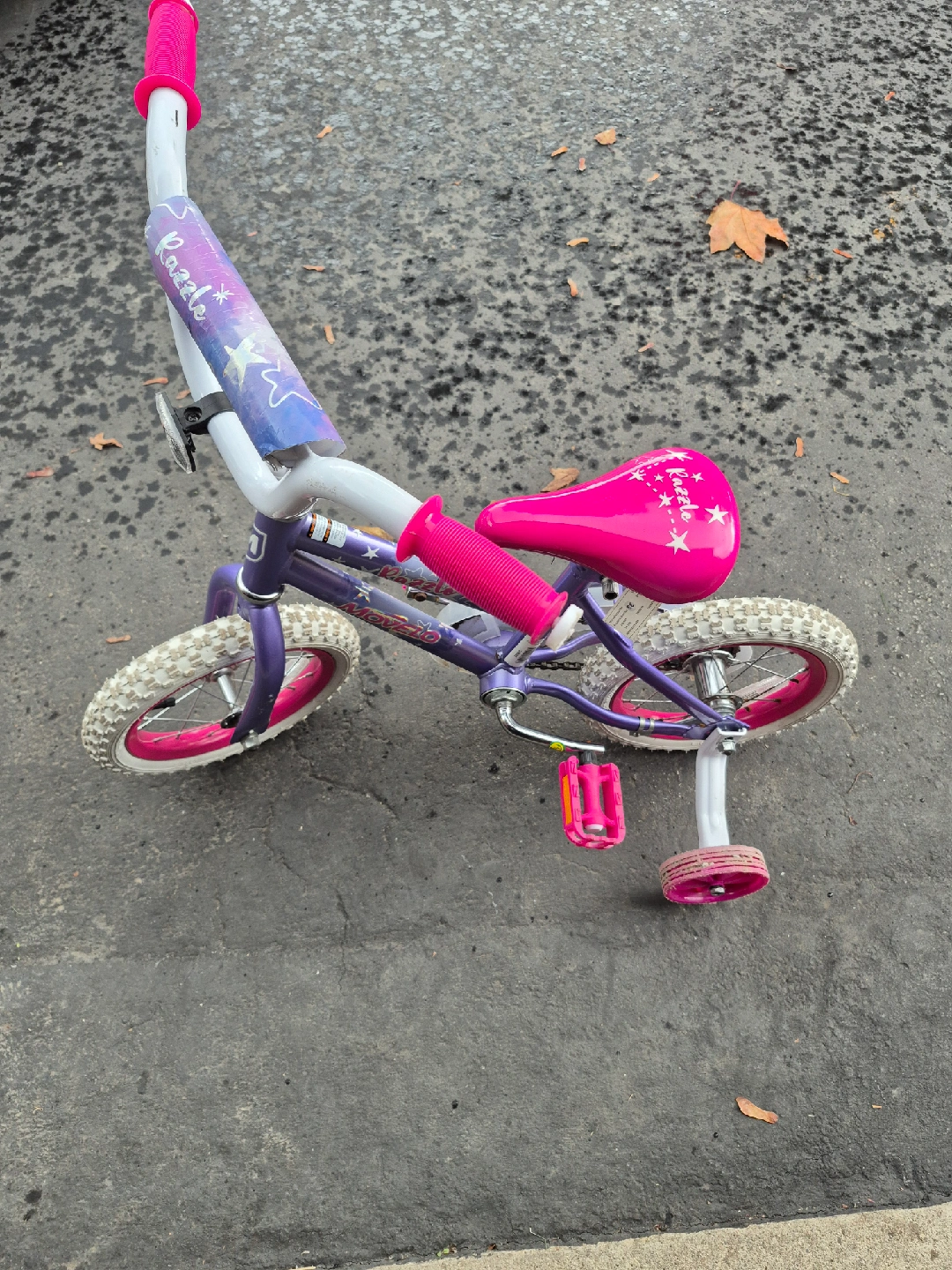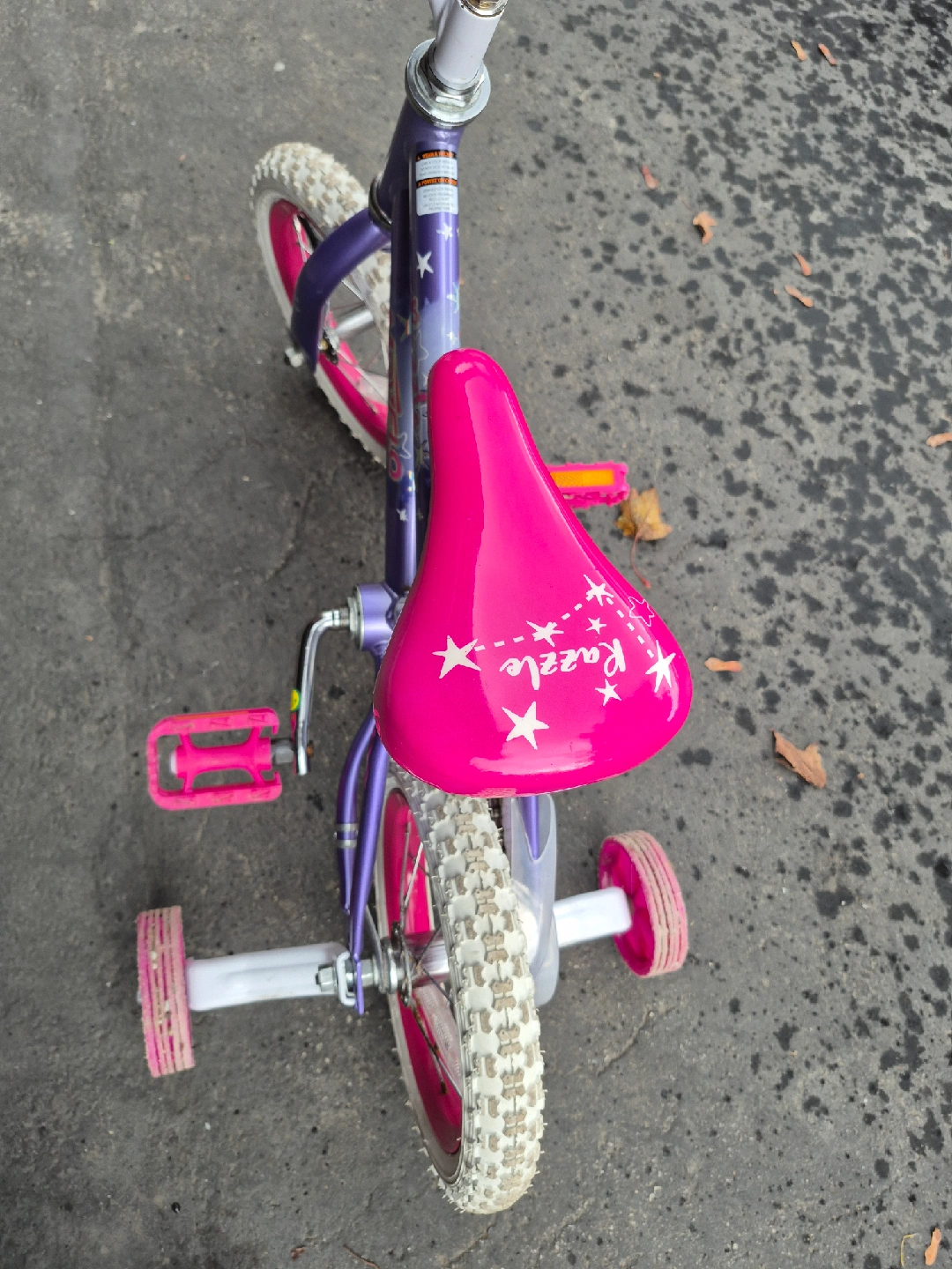 18Selling a cute Razzle kids' bike! It's in great shape and ready for a new rider. The bike features a fun pink and purple colour scheme that any child would love. Perfect for learning to ride! Includes training wheels. 12 inch wheels.