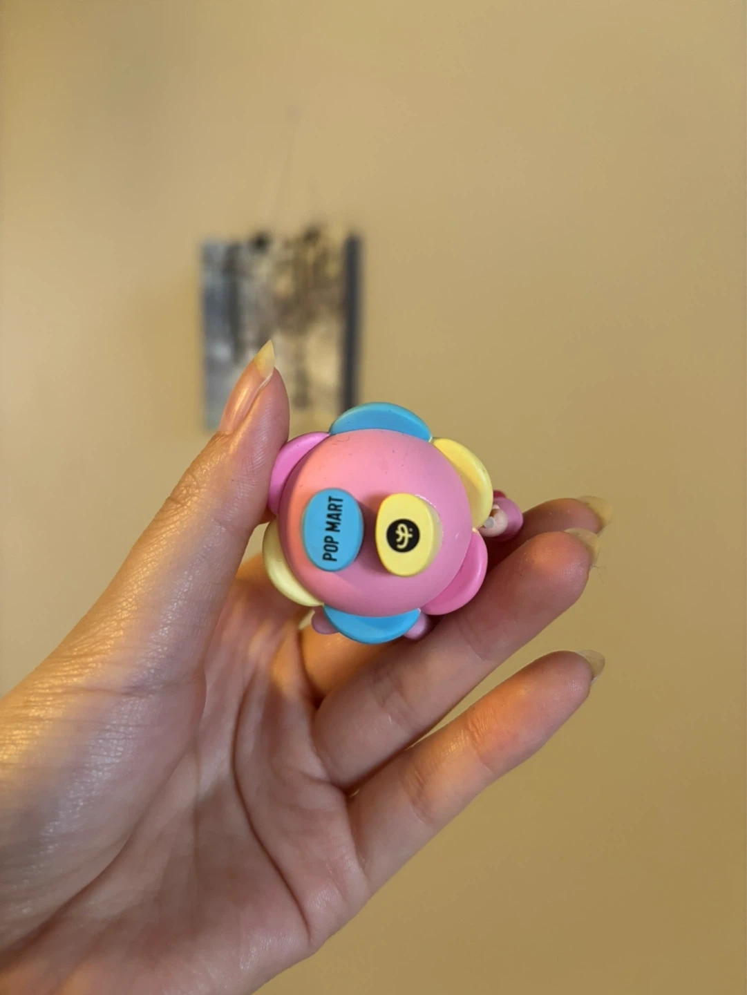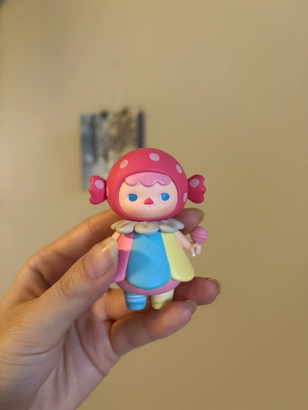 This is a POP MART Molly figure. It's a collectible toy with a colourful outfit and a playful design. A fun piece for collectors!
