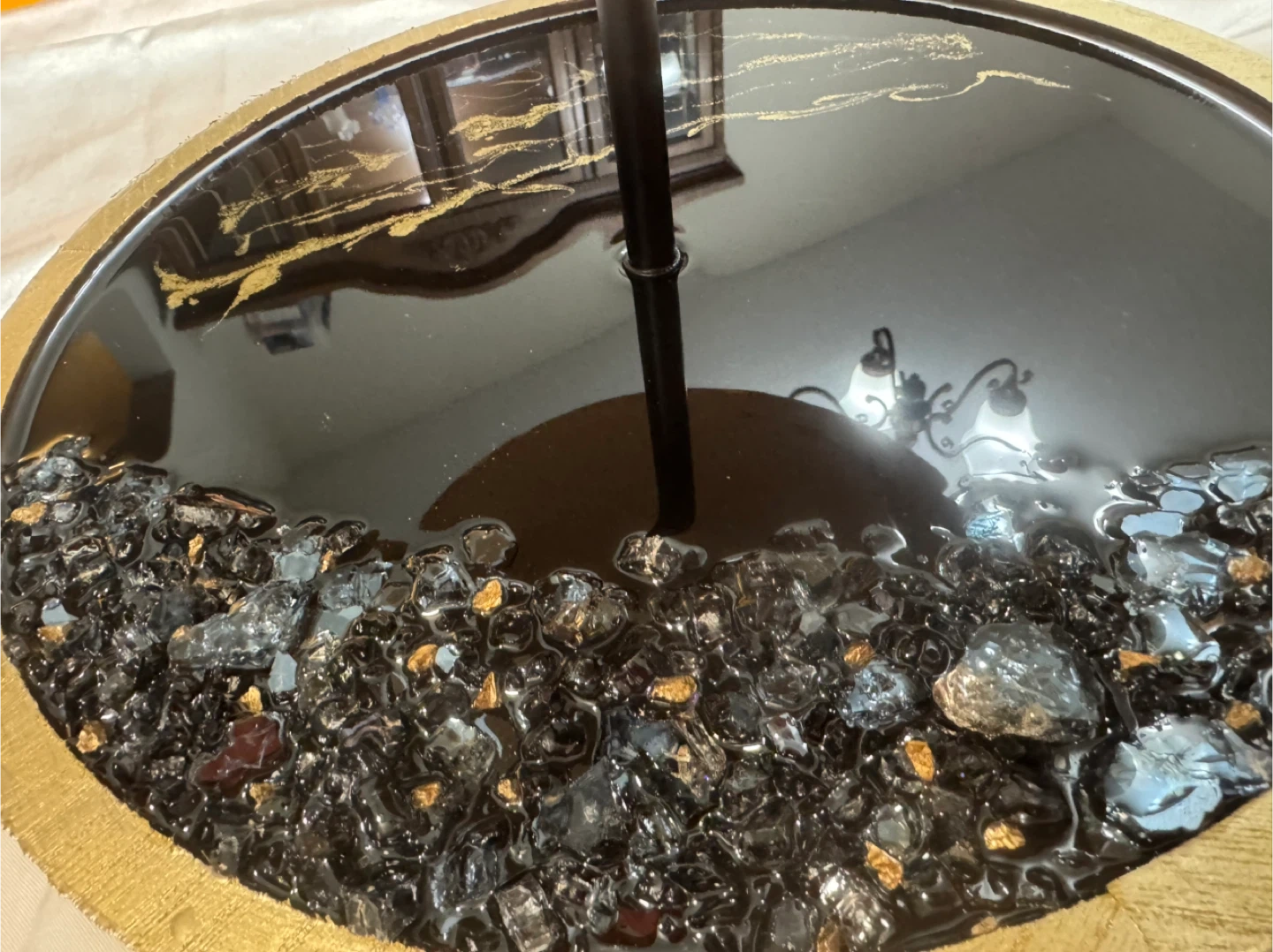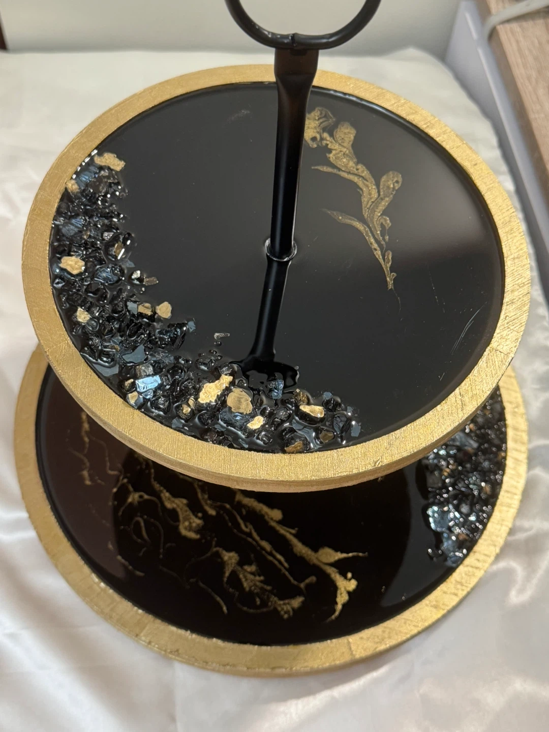 This is a beautiful two-tier decorative tray. It features a striking black and gold colour scheme, making it a stylish addition to any room. The tray is perfect for displaying decorative items or serving treats. It's in great condition and ready to add a touch of elegance to your home!