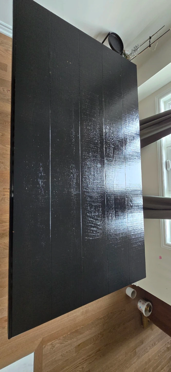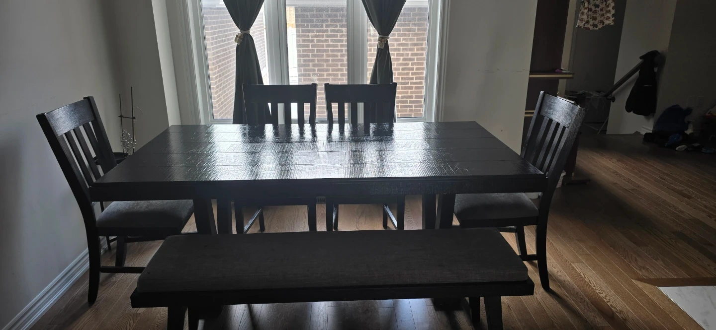 A stylish black dining table set featuring four chairs and a bench. The table has a dark wood finish with a planked top. Chairs and bench have grey upholstered seats. Seats up to six people comfortably. Slightly damaged support beam on one of the chairs. Otherwise everything is good.