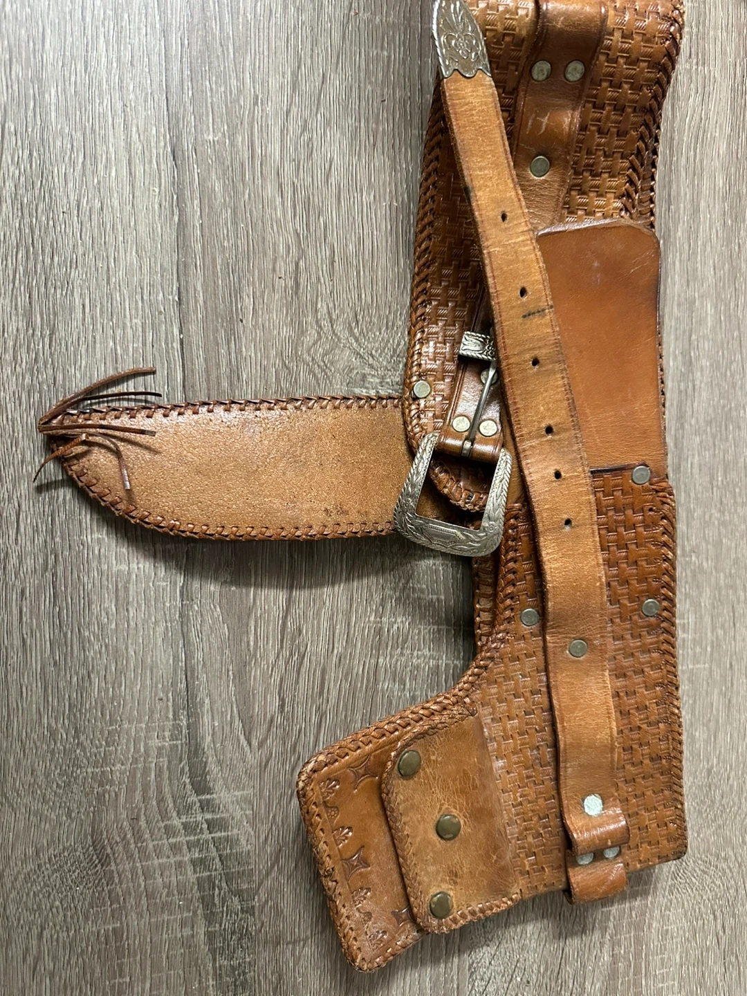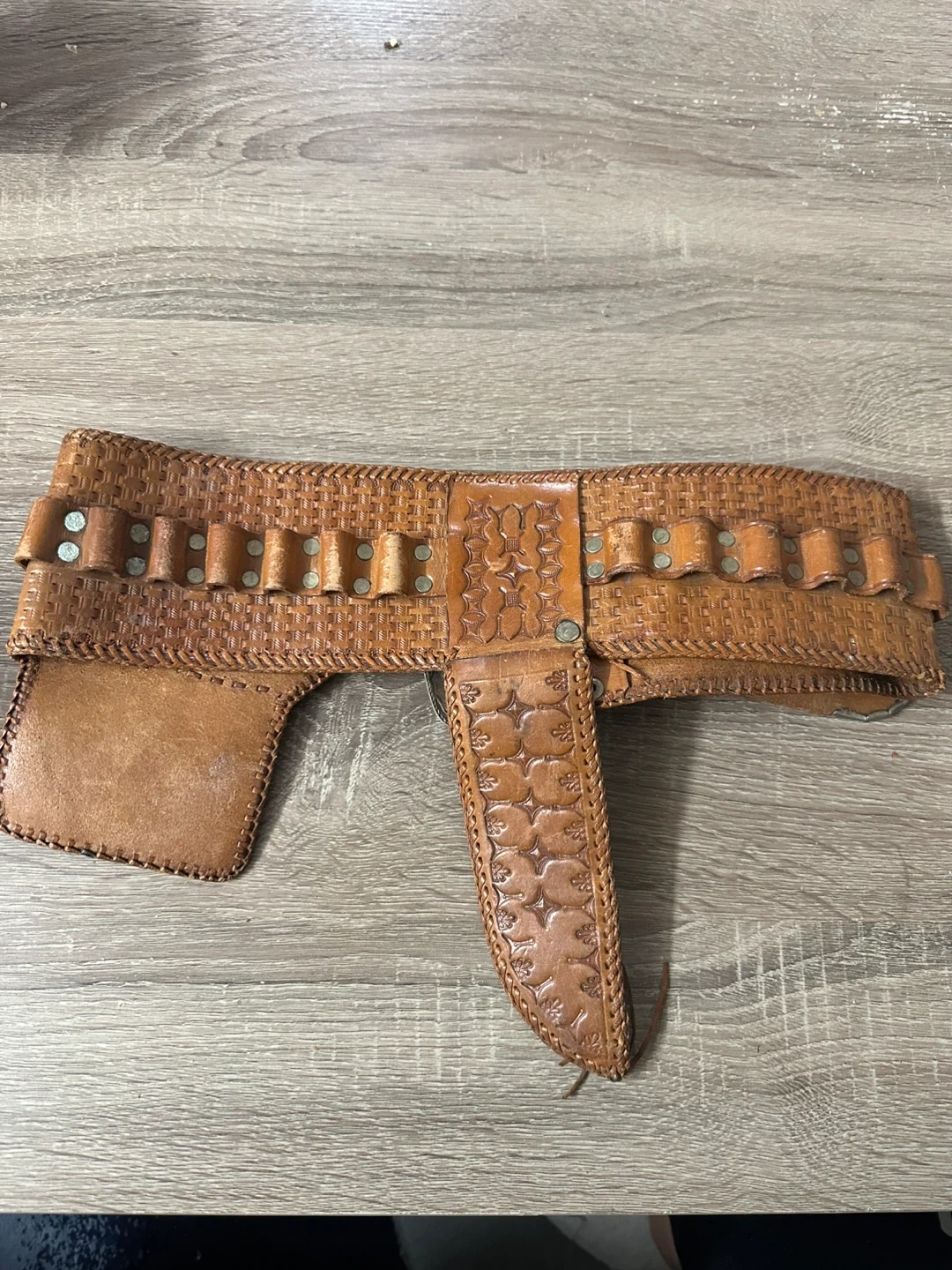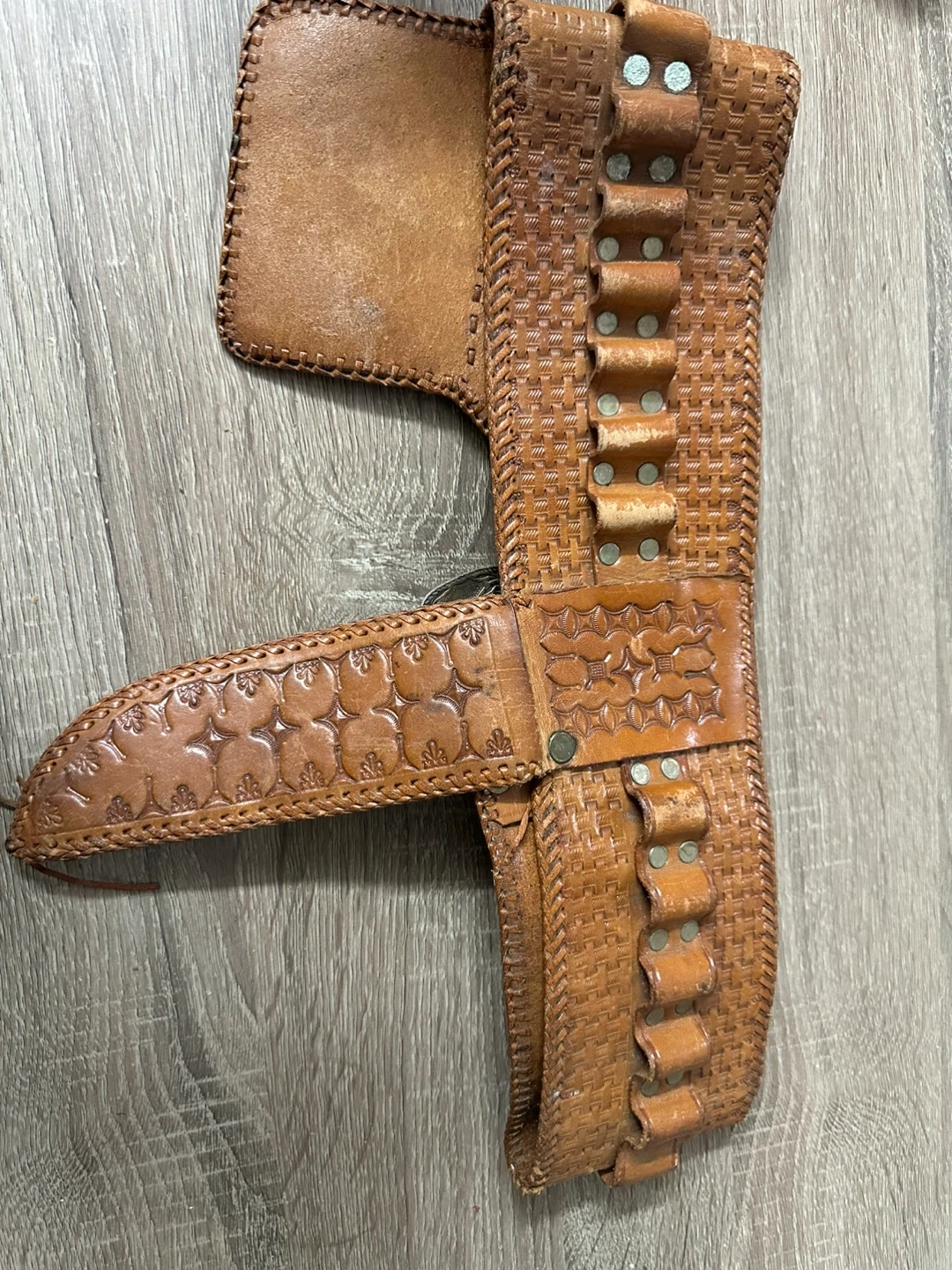 Vintage leather holster belt with a Western design. It features multiple loops for ammunition and a holster for a handgun. The leather is intricately tooled.