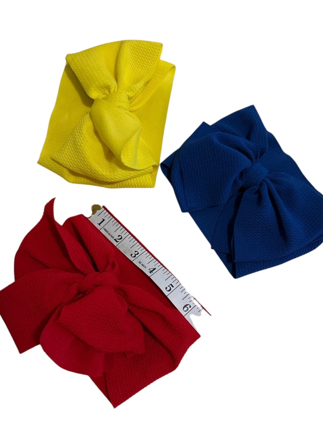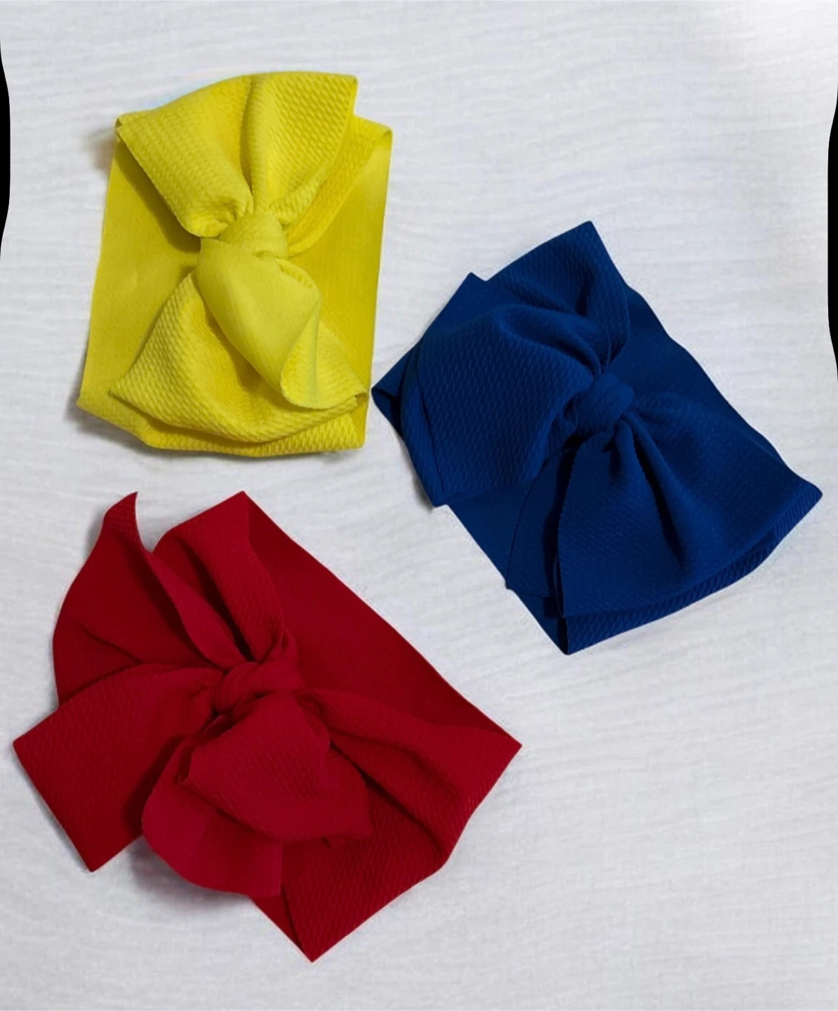 Set of three stretchy baby headbands with bows. Includes one red, one yellow, and one navy blue headband. They're made from a soft, textured fabric for comfort. Perfect for dressing up little ones!