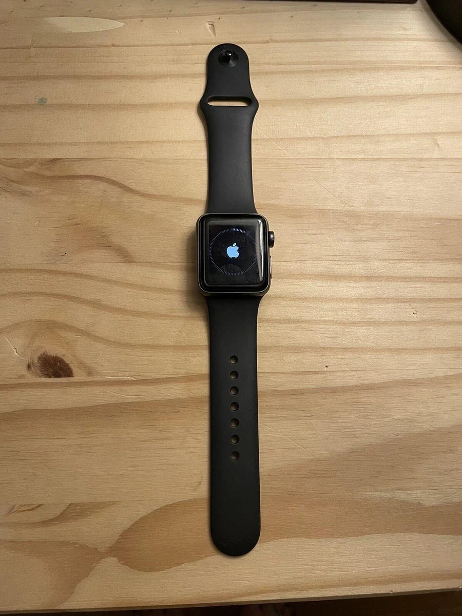 This is an Apple Watch Series 3 with a black band. It's in good condition and ready for a new owner. A charging cable is included.
