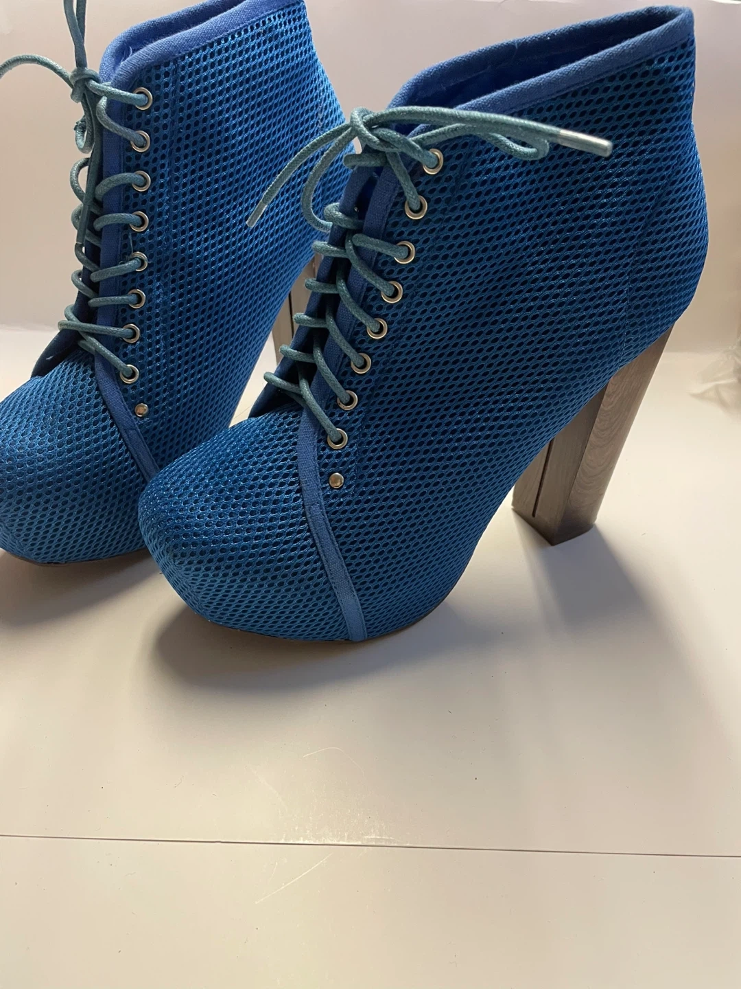 Blue Mesh Lace-Up Heeled Booties