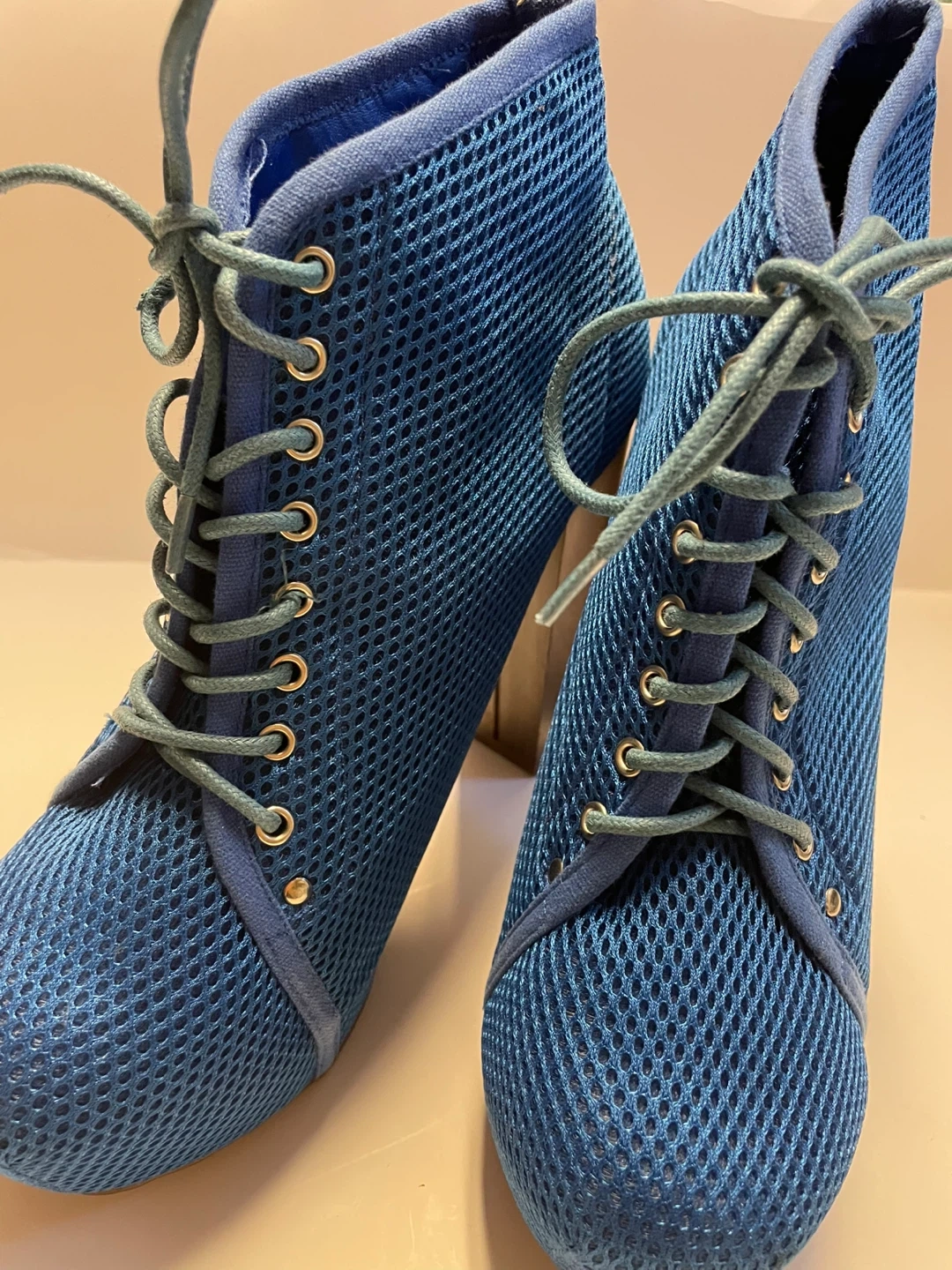 Blue Mesh Lace-Up Heeled Booties