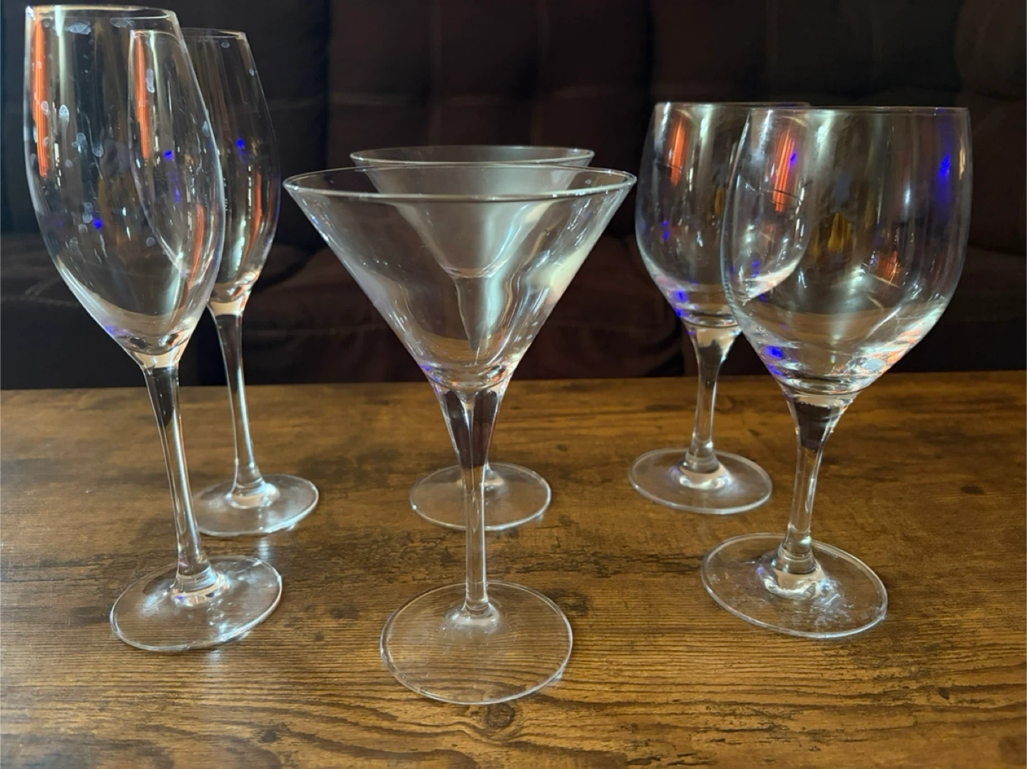 Selling a mixed set of wine glasses. Includes a variety of styles, perfect for different types of wine or cocktails. Great for adding a touch of elegance to your home bar or dinner parties.