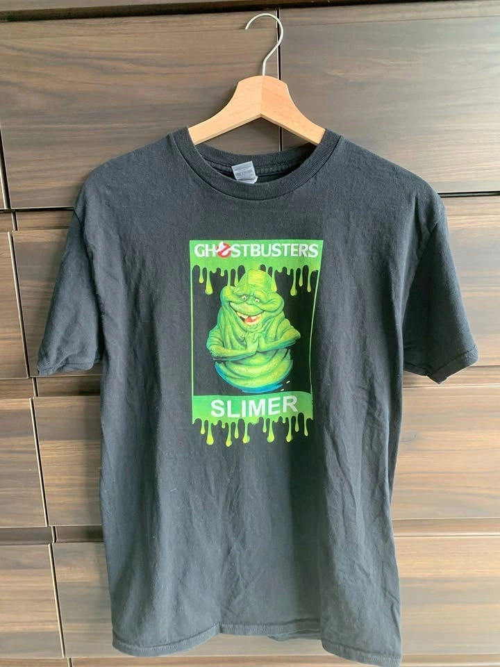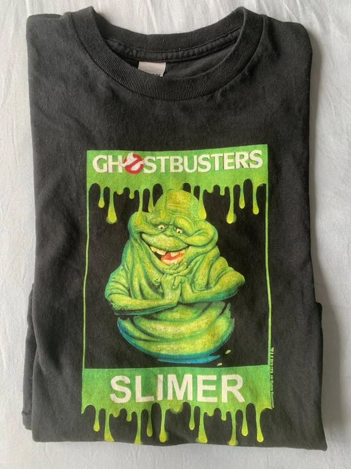 Ghostbusters Slimer T-shirt. Black colour, unisex, size Medium. 100% cotton. Seldom worn, in good condition. From a smoke-free and pet-free home. Pick up in Willoughby, Langley. CASH ONLY.