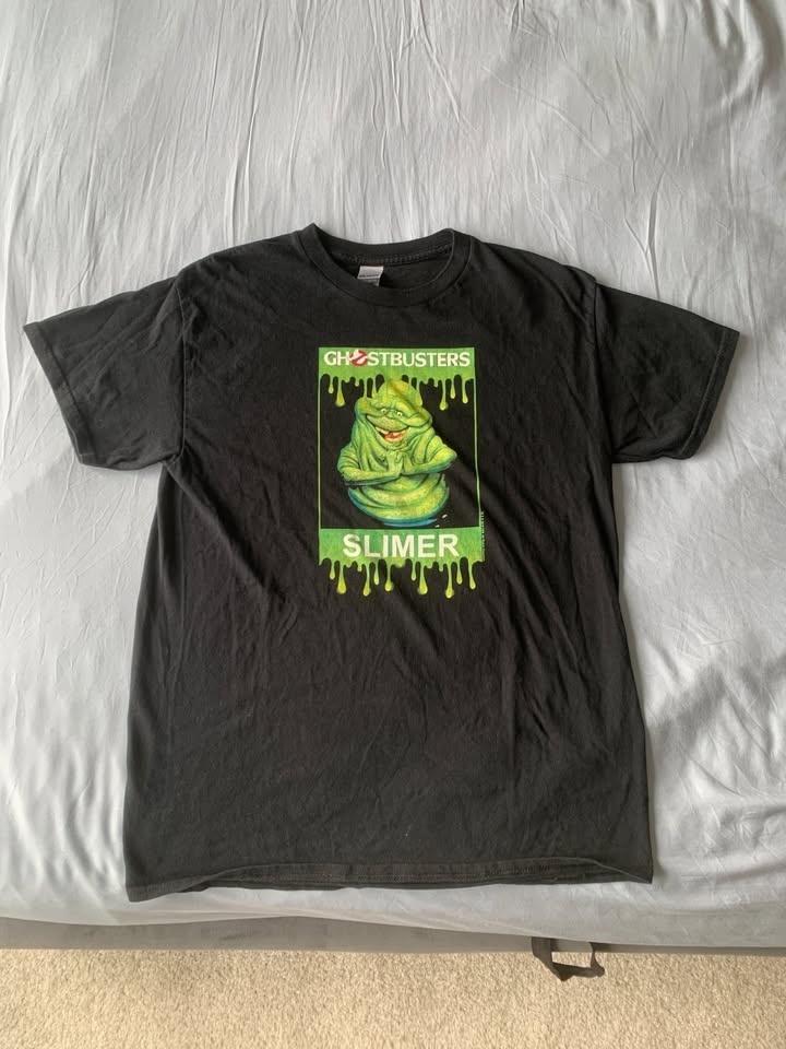 Ghostbusters Slimer T-shirt. Black colour, unisex, size Medium. 100% cotton. Seldom worn, in good condition. From a smoke-free and pet-free home. Pick up in Willoughby, Langley. CASH ONLY.