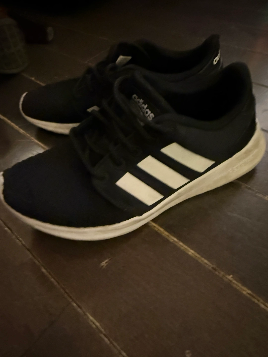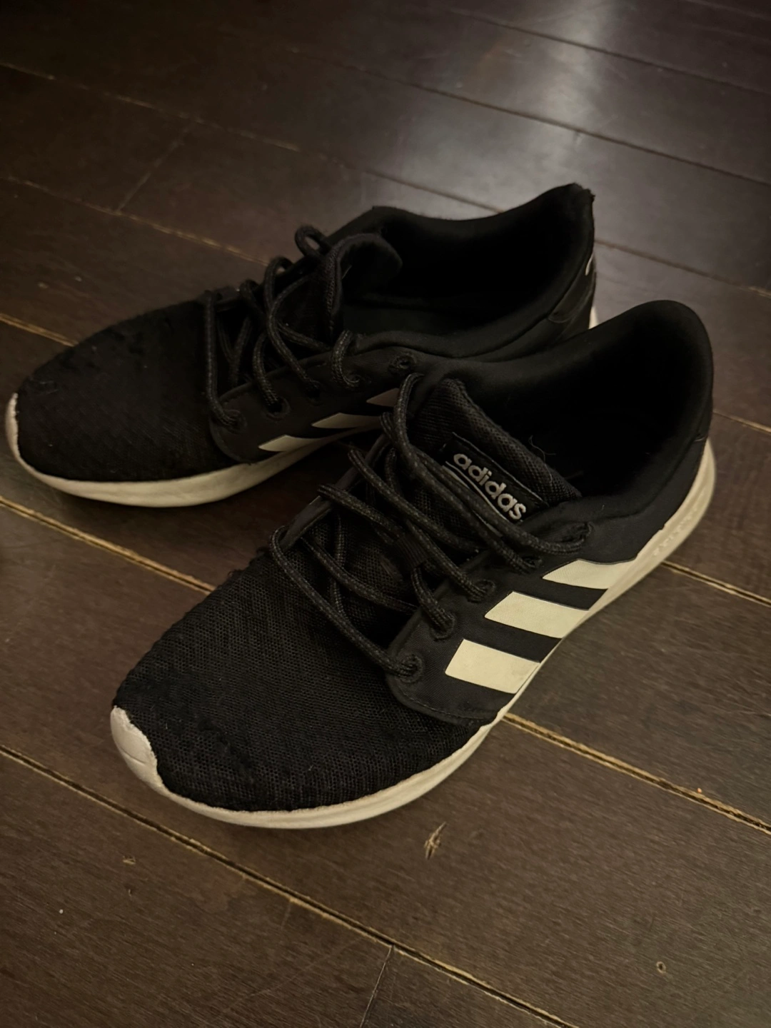Selling a pair of Adidas sneakers. They're black with the classic three white stripes. They show some signs of wear, but are still in good condition for everyday use
