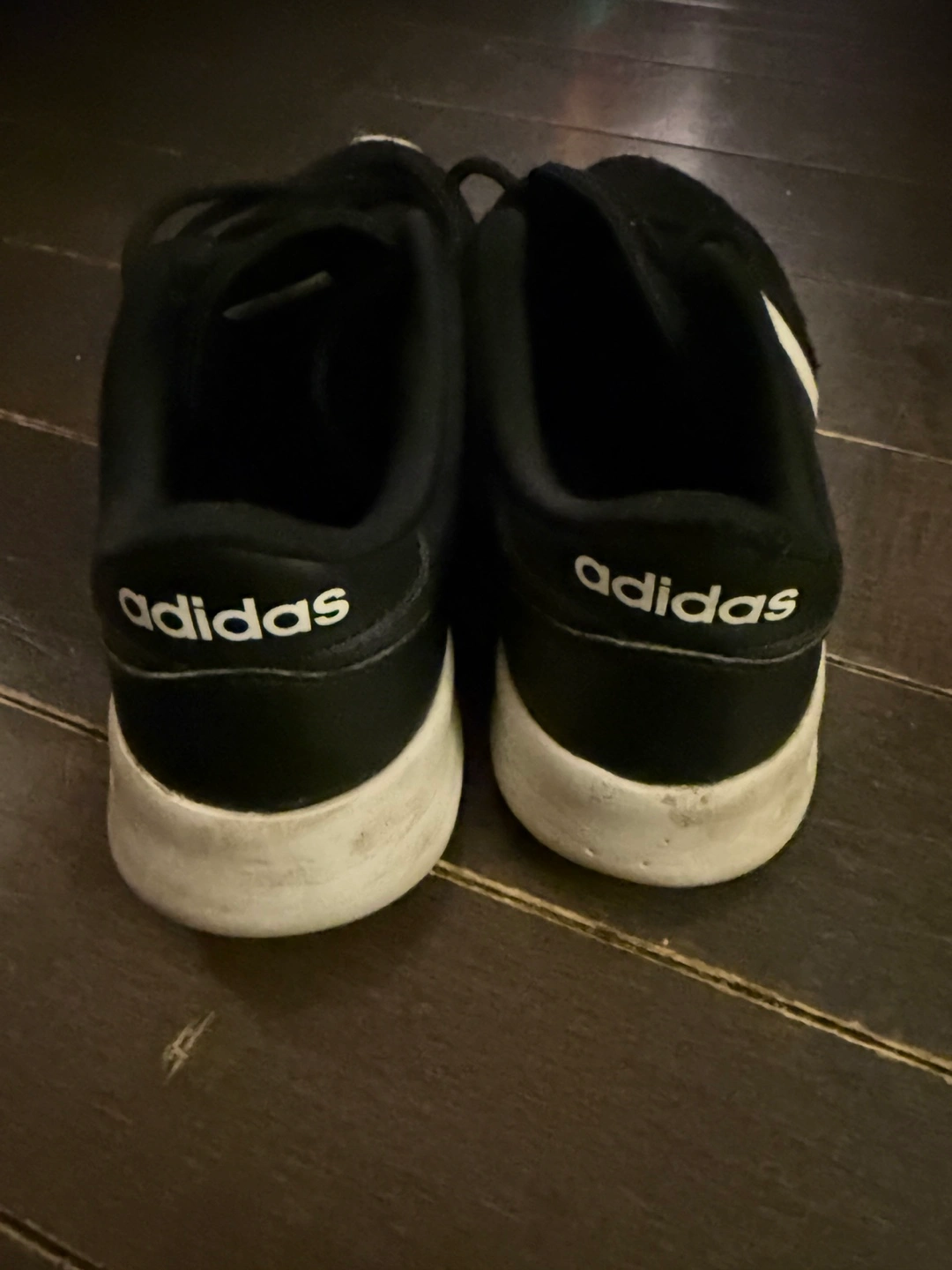 Selling a pair of Adidas sneakers. They're black with the classic three white stripes. They show some signs of wear, but are still in good condition for everyday use