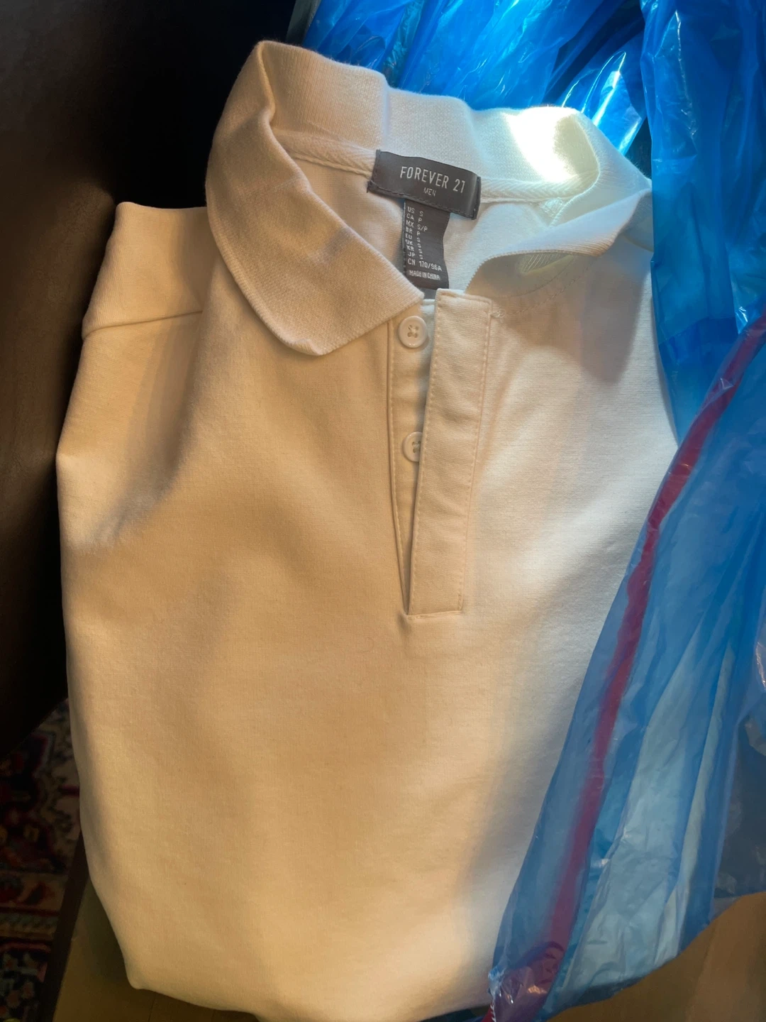 A classic white polo shirt from Forever 21. It's made of comfortable material. Great for casual wear plus lots of otjer items.