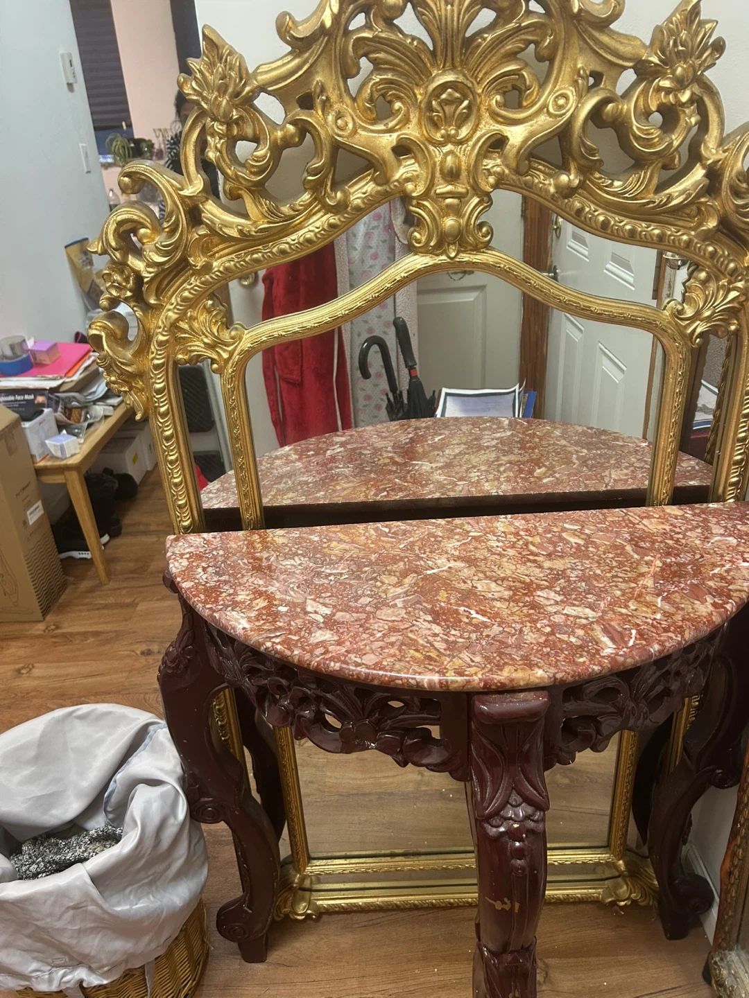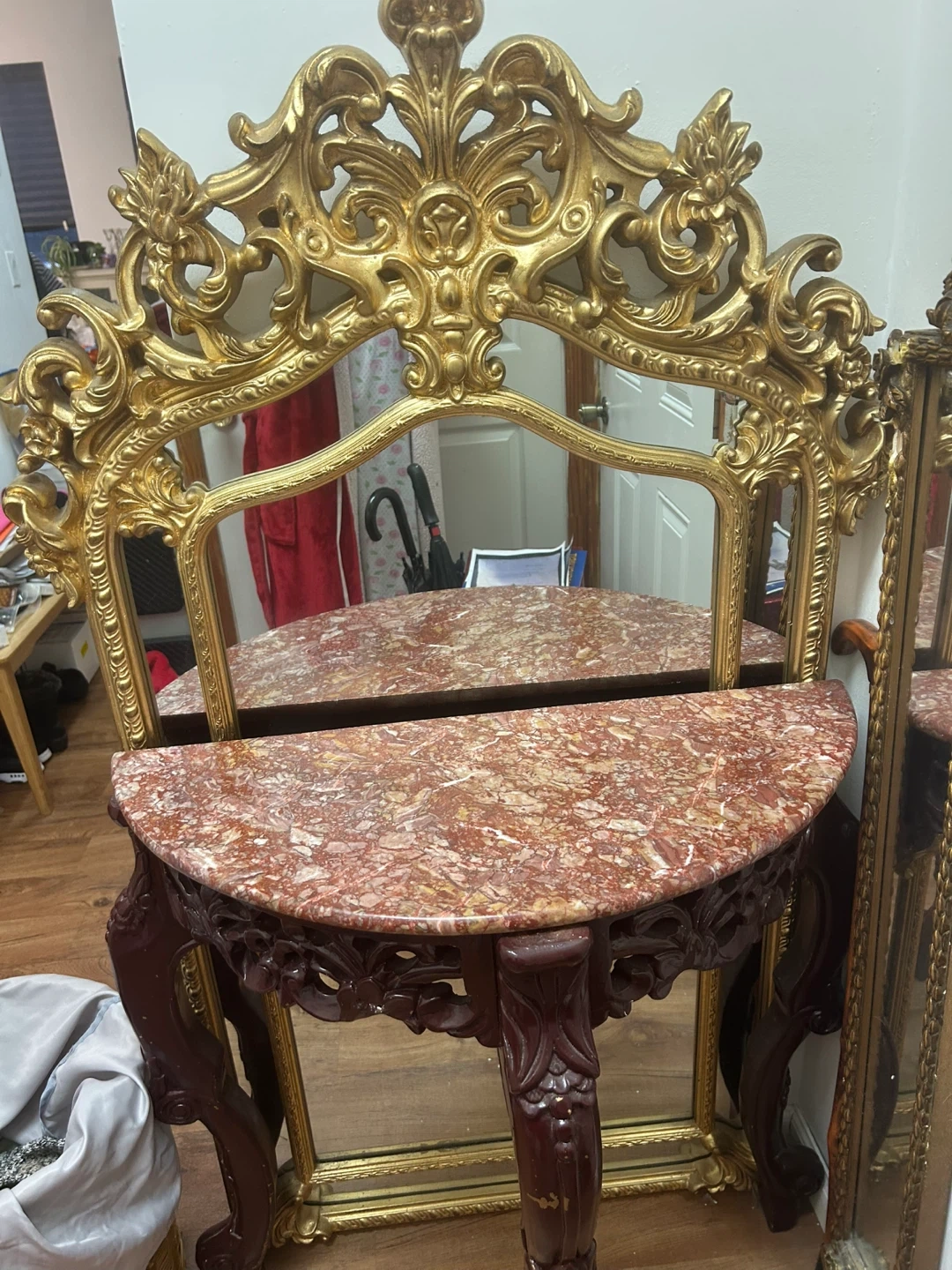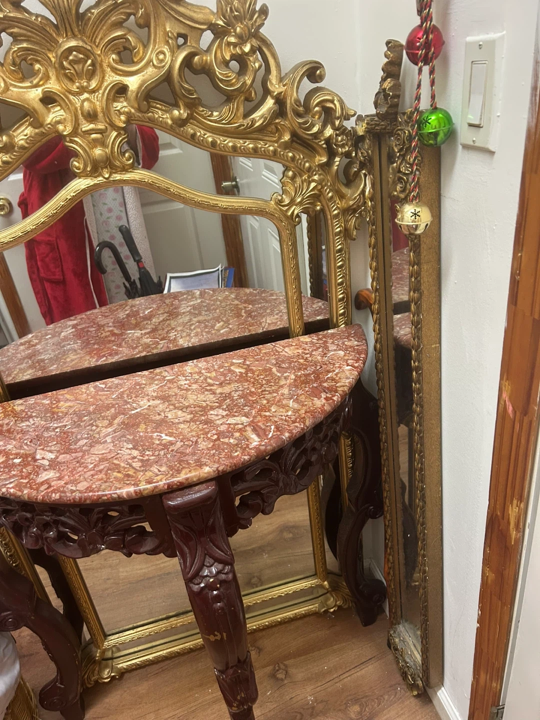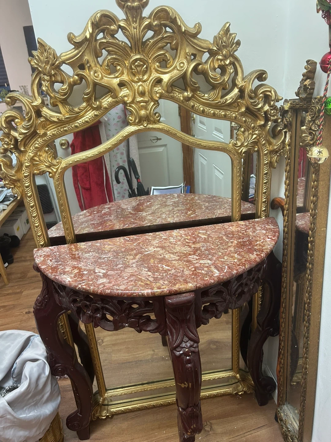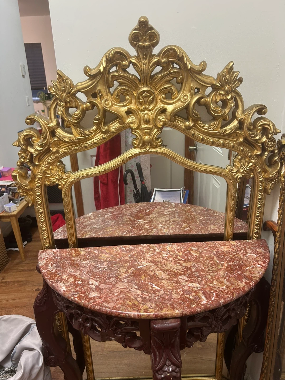This is an ornate console table with a rich mahogany-colored wood base and intricately carved legs. It features a stunning red and white marble top. The accompanying mirror has an elaborate gold-gilt frame. This piece adds a touch of vintage elegance to any entryway or living space!