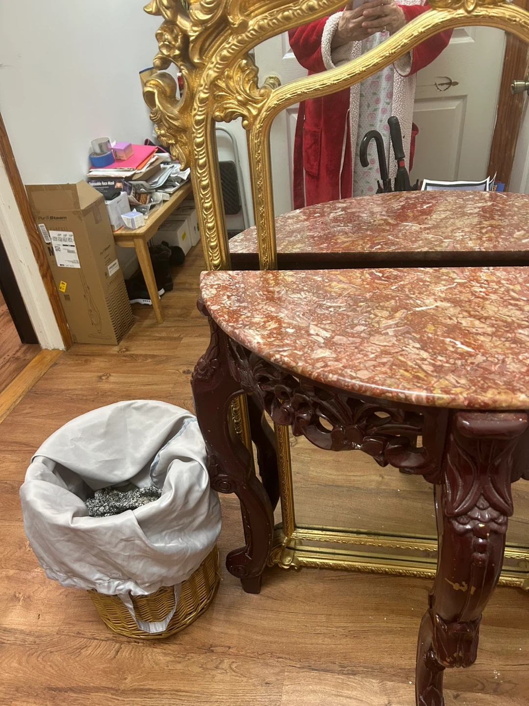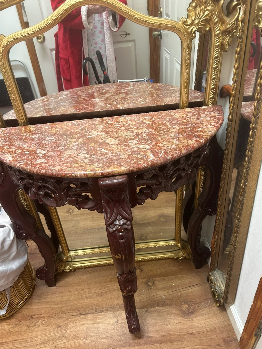 This is an ornate console table with a rich mahogany-colored wood base and intricately carved legs. It features a stunning red and white marble top. The accompanying mirror has an elaborate gold-gilt frame. This piece adds a touch of vintage elegance to any entryway or living space!