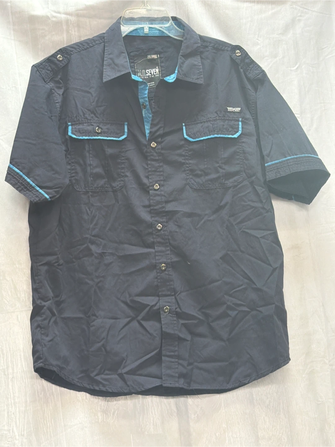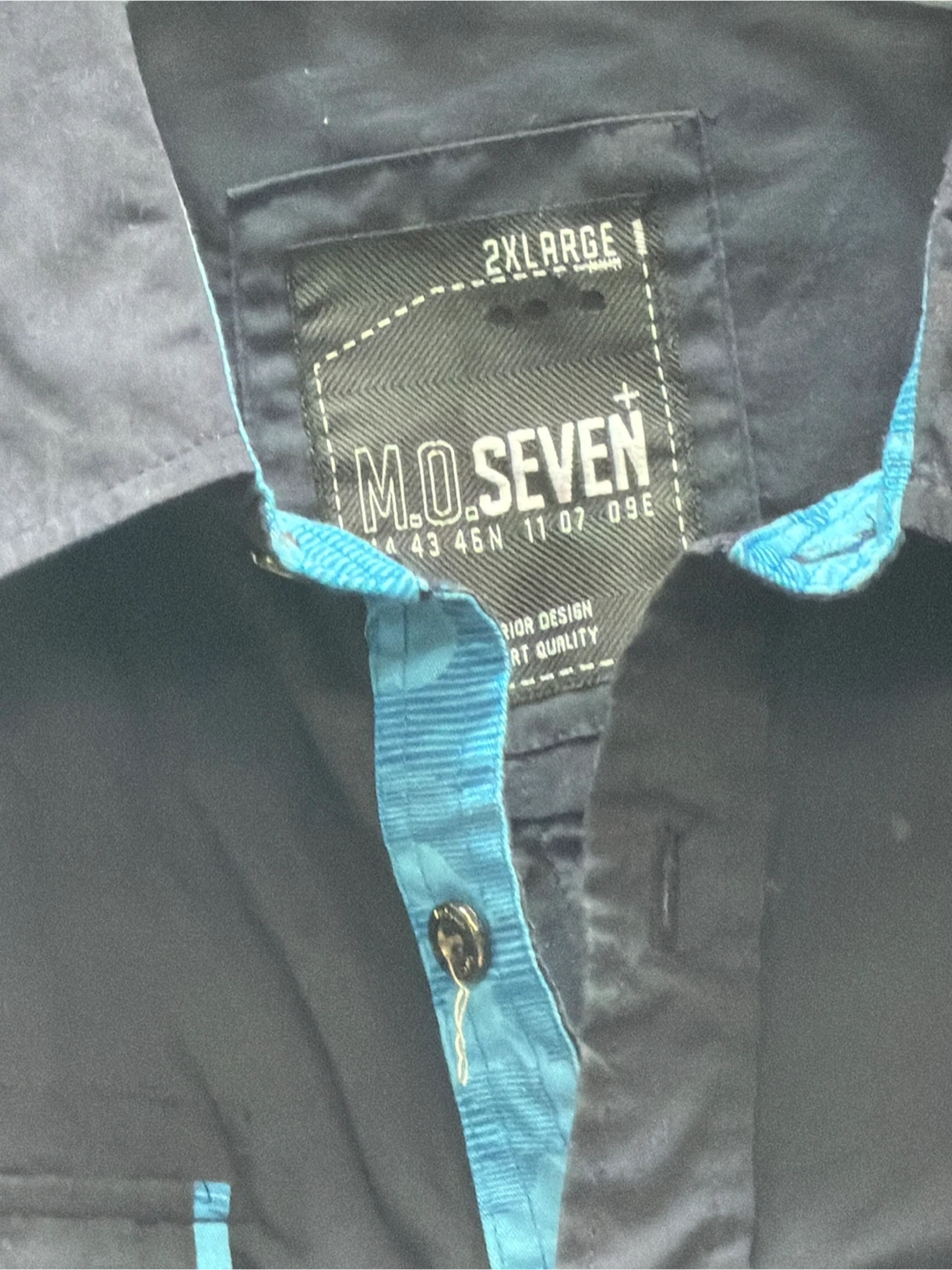 This is an M.O. SEVEN men's short sleeve button-up shirt. It's a size 2XL and features a navy blue color with bright blue accents on the collar, pockets, and sleeves. The shirt has two front pockets with button closures.