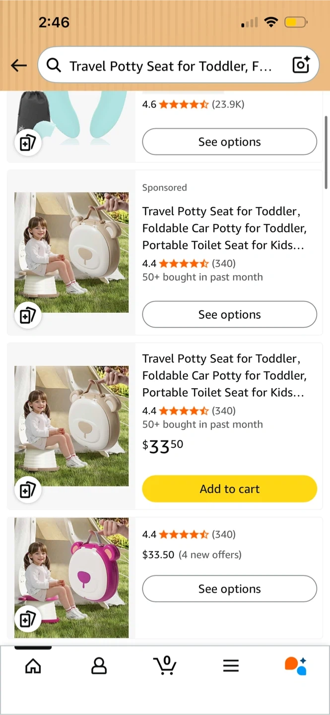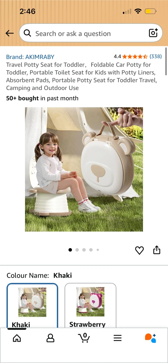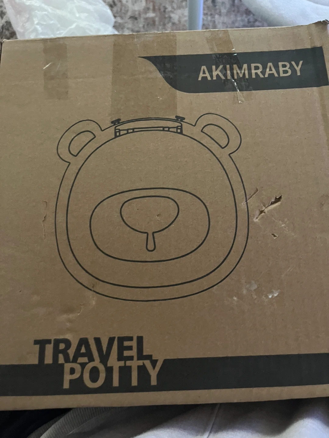 This AKIMRABY travel potty is designed for toddlers. It's foldable and portable, making it convenient for car trips and camping. The potty comes in a khaki colour.