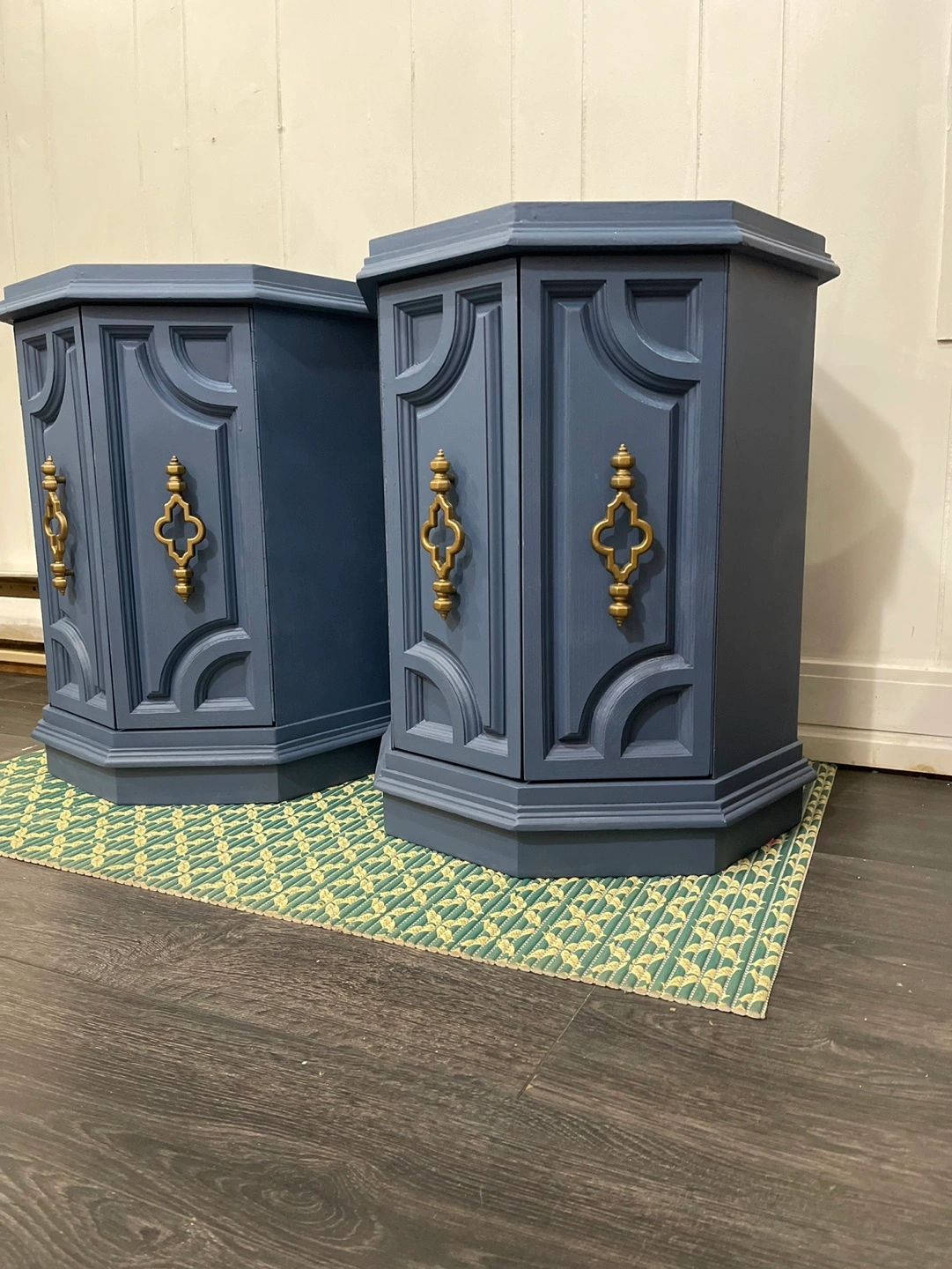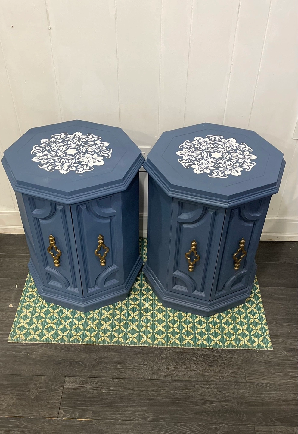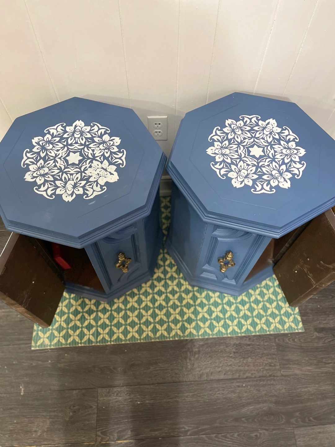 I am selling ๐๐๐ข๐ซ ๐จ๐ beautiful ๐ก๐๐ง๐ ๐ฉ๐๐ข๐ง๐ญ๐๐ wooden Hexagonal Accent Tables painted in professional-grade cabinet paint. The color is ๐๐จ๐๐ฌ๐ญ๐๐ฅ ๐๐ฅ๐ฎ๐ which has a royal aesthetic. The cabinets with ๐ฆ๐๐ ๐ง๐๐ญ๐ข๐ ๐๐จ๐จ๐ซ ๐๐๐ญ๐๐ก๐๐ซ are quite deep and ๐ฌ๐ฉ๐๐๐ข๐จ๐ฎ๐ฌ. It is a sturdy piece of very ๐ ๐จ๐จ๐ ๐ช๐ฎ๐๐ฅ๐ข๐ญ๐ฒ ๐ฌ๐จ๐ฅ๐ข๐ ๐ฐ๐จ๐จ๐ and is quite heavy.