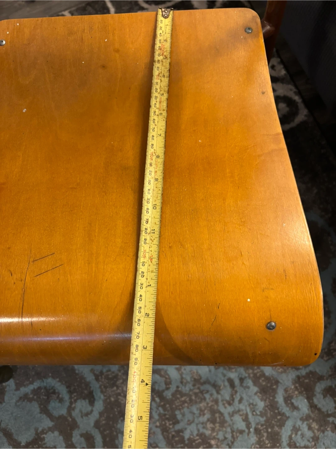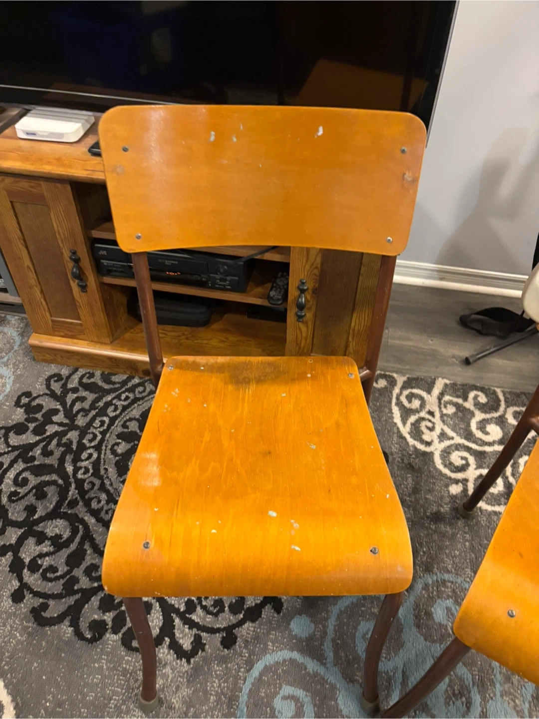This is a classic wooden school chair with a metal frame. It has a golden brown wooden seat and back. These chairs are perfect for a retro-themed dining area or extra guest seating