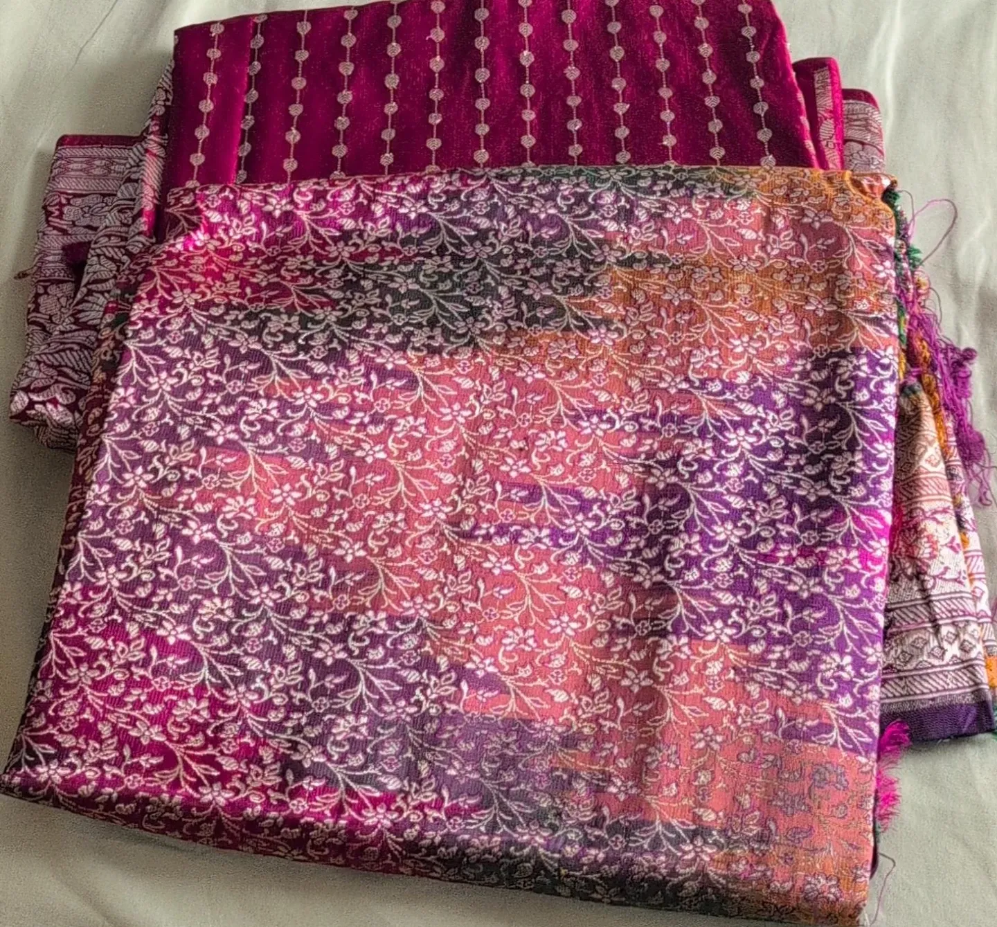 Beautiful sari fabric with vibrant floral patterns. It's a mix of pink, purple, and orange tones with intricate white embroidery. Perfect for crafting or creating traditional garments!