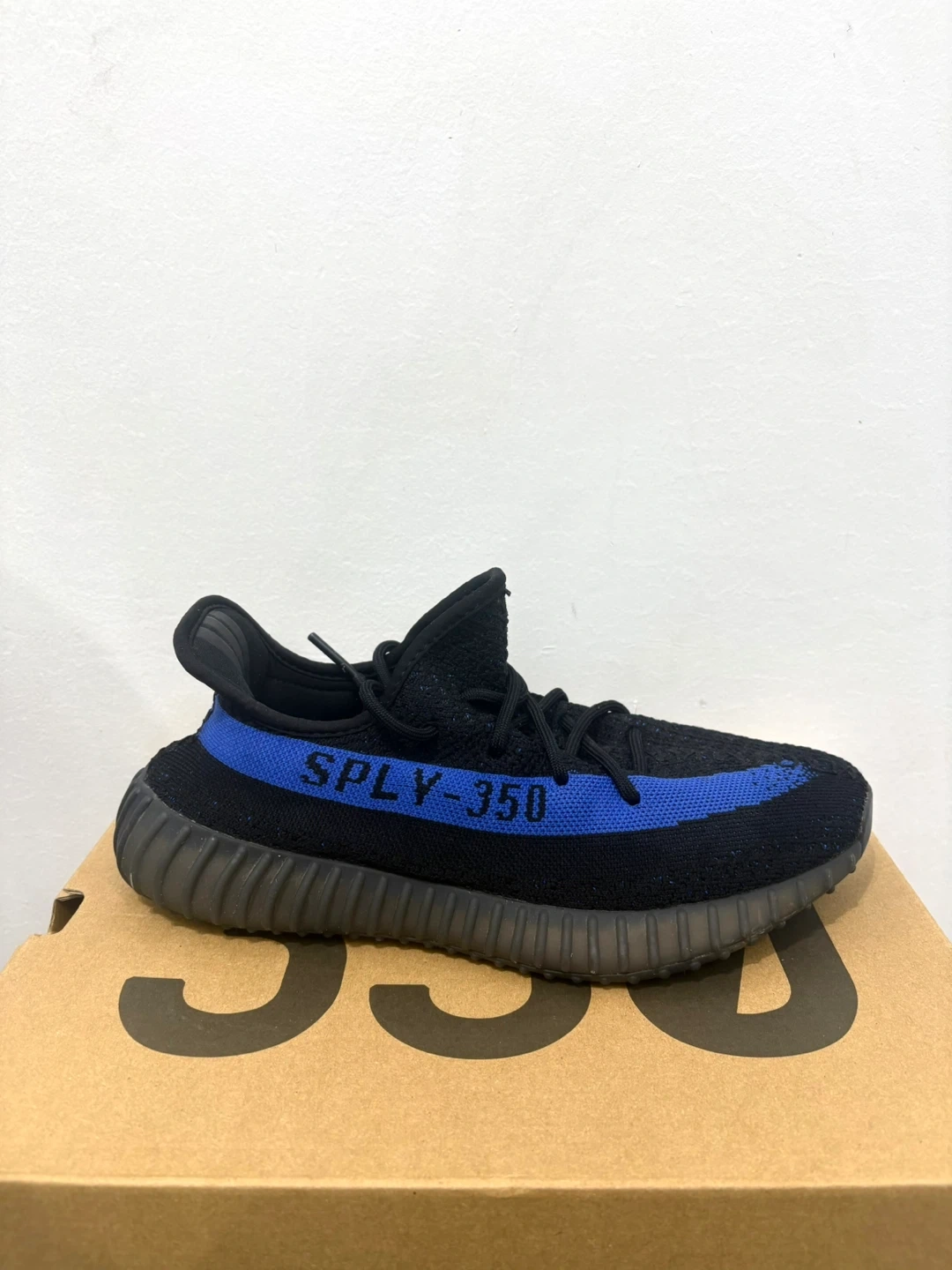 Adidas Yeezy Boost 350 V2 sneakers in black with royal blue "SPLY-350" stripe. Features a Primeknit upper and a translucent rubber sole. These are a size 10.