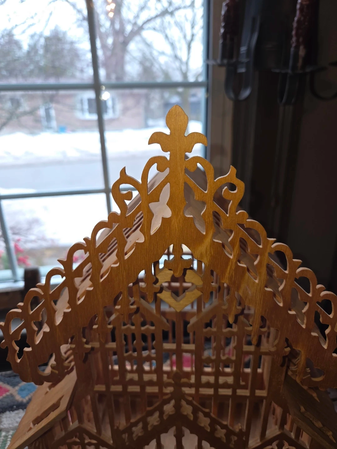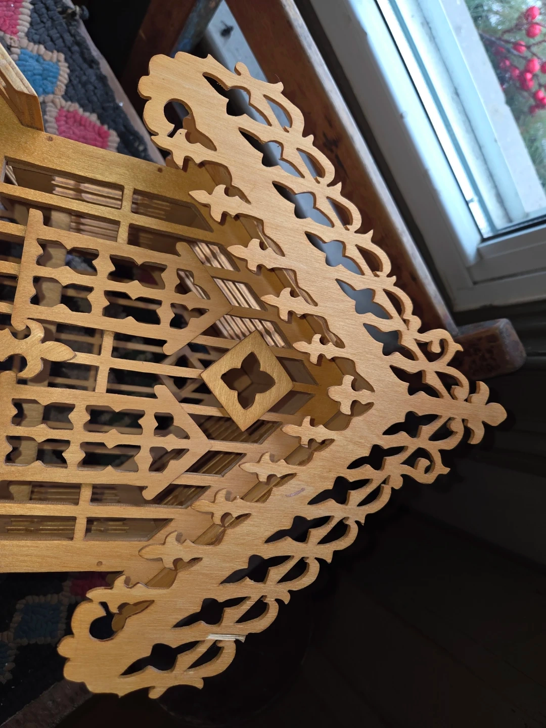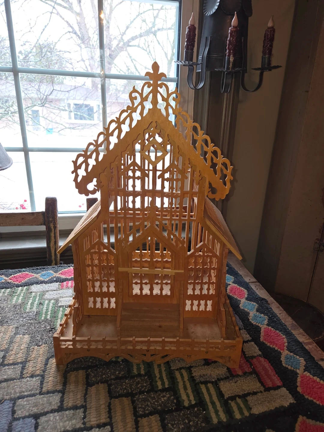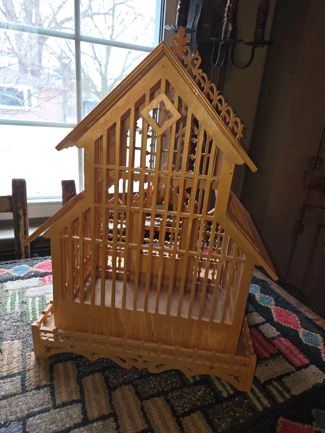 This is a decorative wooden bird cage with intricate fretwork details. It features a tiered roof design and ornate trim along the base. It's a charming piece for display or as a unique accent.