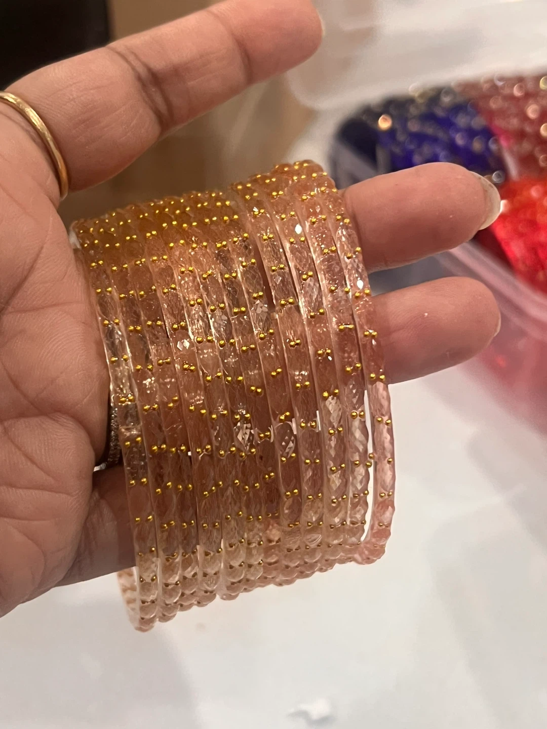 This set features 10 light pink bangles, each adorned with small gold beads. They're made of clear, textured plastic with a subtle faceted design. Great for adding a touch of sparkle to any outfit!