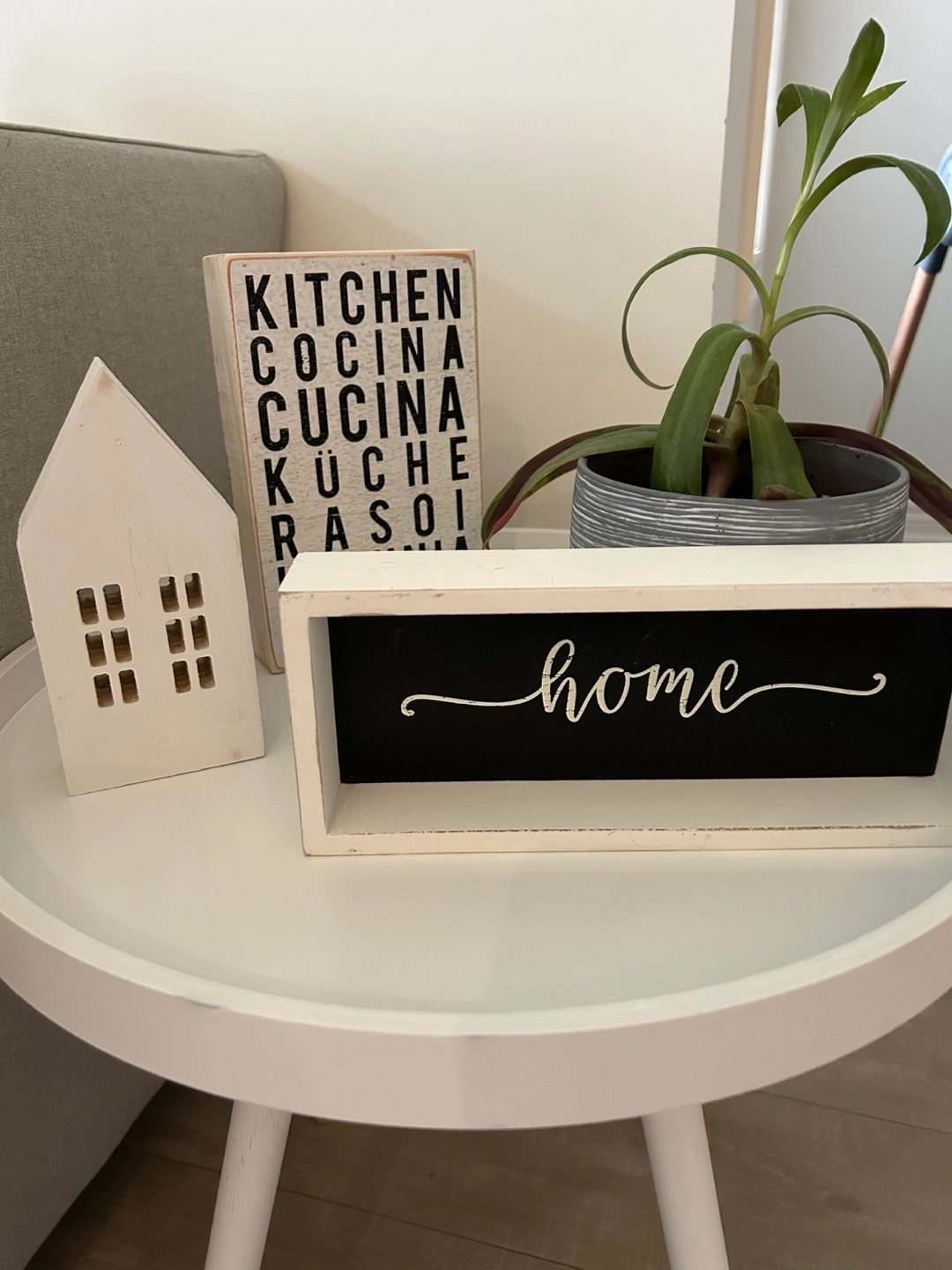 Adorable farmhouse decor set. Includes a small wooden house, a black and white kitchen sign, and a black and white home sign. Perfect for a cozy space.