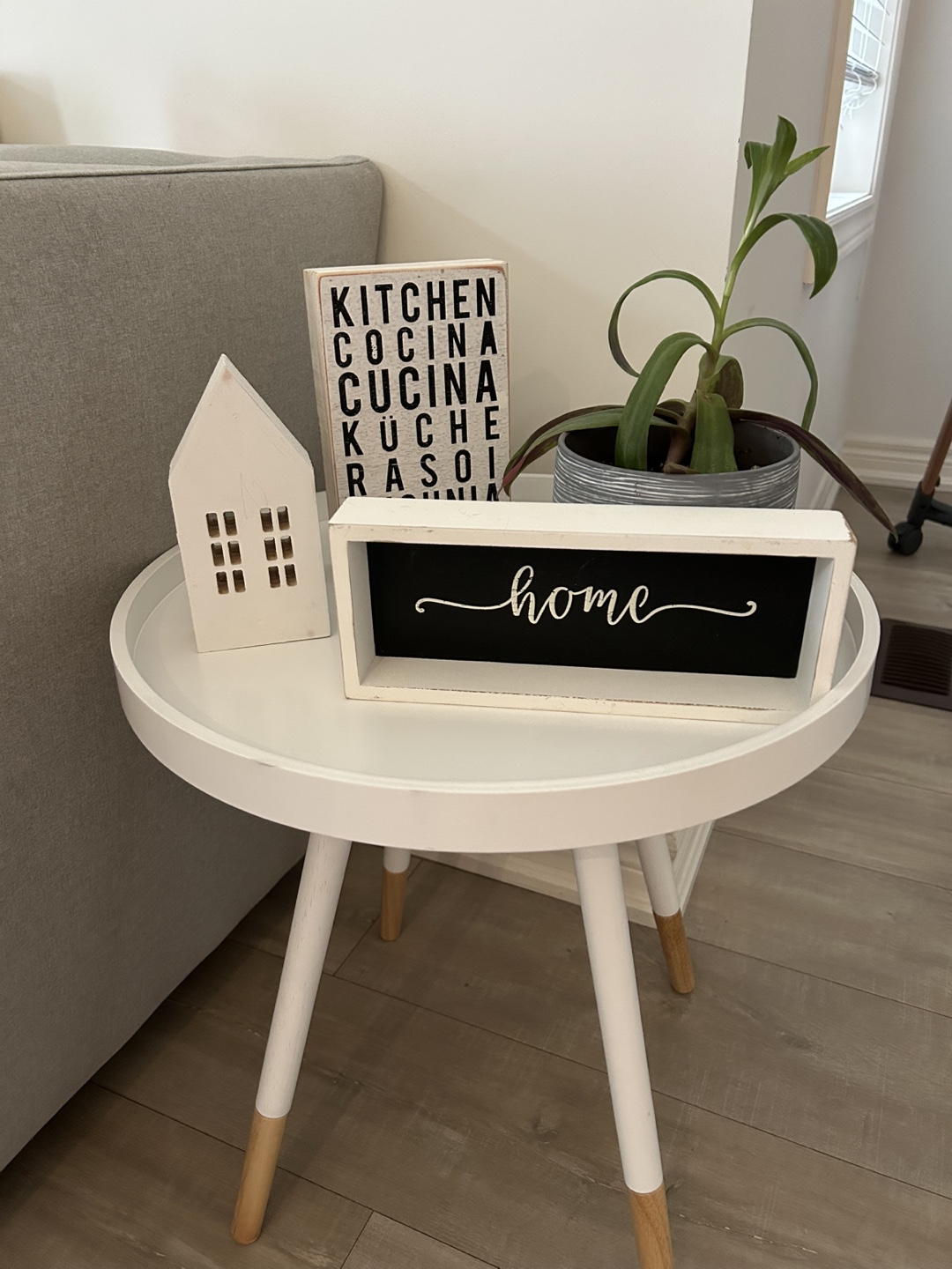 Adorable farmhouse decor set. Includes a small wooden house, a black and white kitchen sign, and a black and white home sign. Perfect for a cozy space.