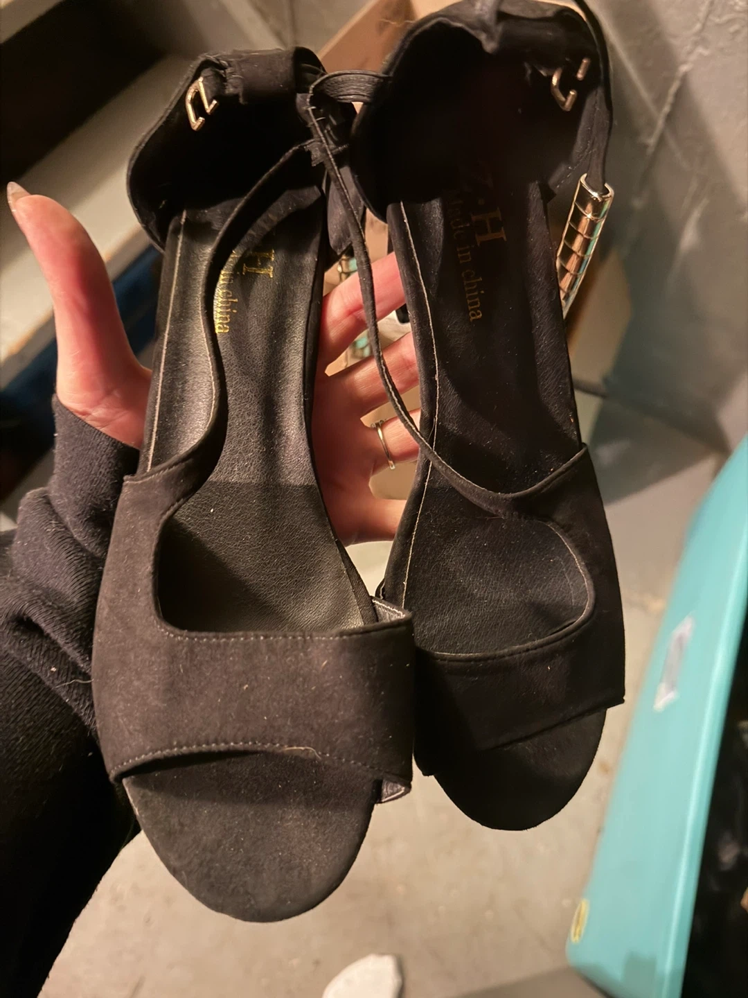 These black ankle strap heels are made from a suede-like material. They feature a decorative gold accent on the heel strap. Made in China.