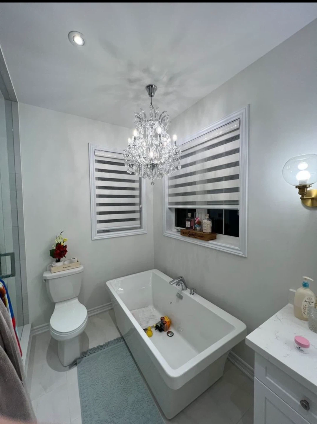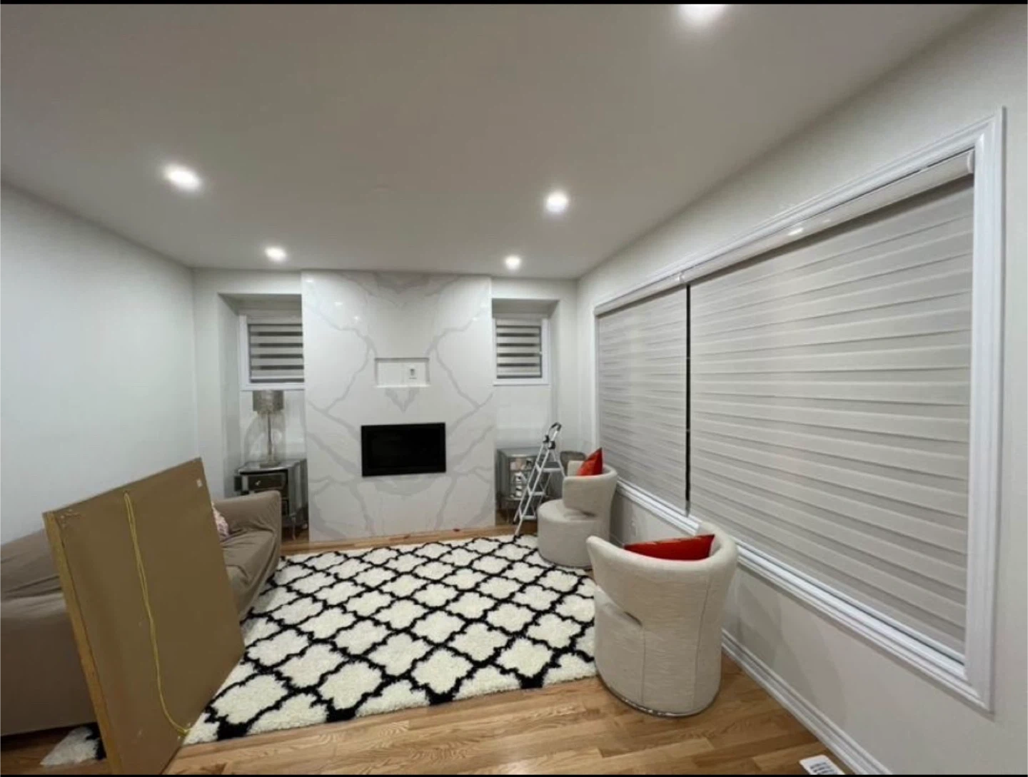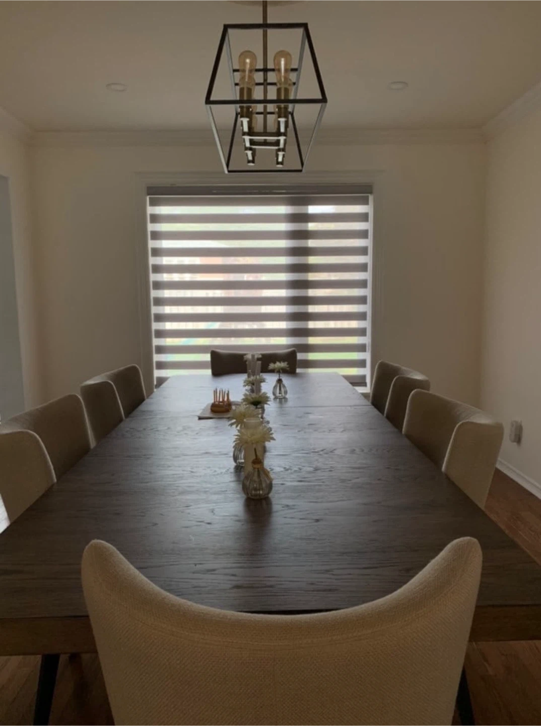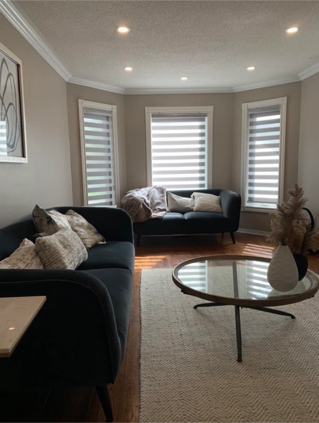 These brand new zebra blinds offer adjustable light control. They're a dual-layer window covering with alternating sheer and opaque stripes. Perfect for privacy and dimming natural light throughout the day!